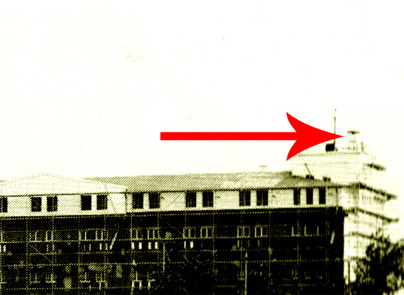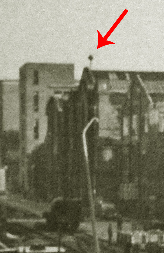 Oben im Bild rechts der Aufbau. Unten im Bild erkennbar wahrscheinlich die innere Sirenenhalterung im Dachstuhl, die noch bis zum Abriss des Gebäudes vorhanden gewesen sein dürfte.