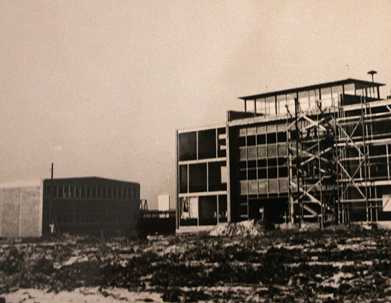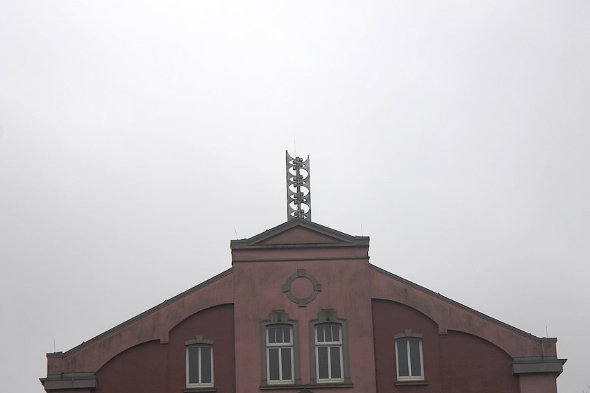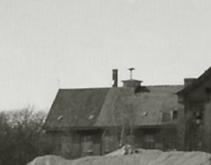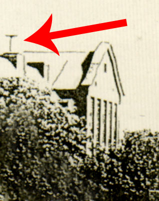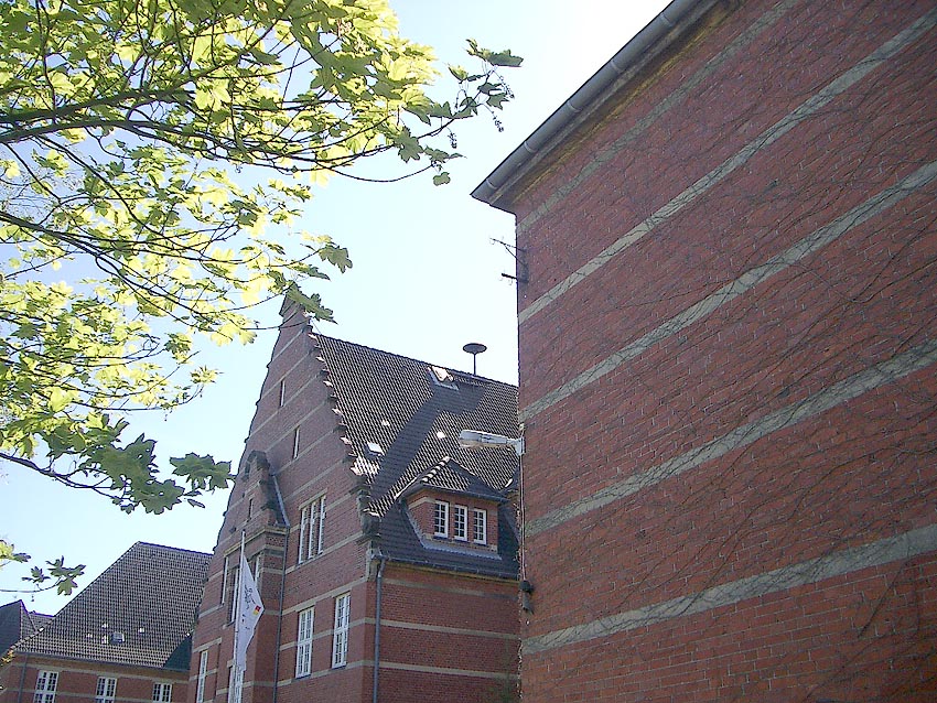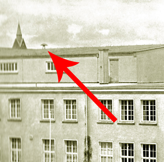 64. Kein Foto: Wohl Sirene aus dem WK 2 (wohl Zweifachsirene) auf dem Dach des historischen Gebäudes der heutigen Marineanlage Bordum (zur damaligen Zeit "Max-Planck-Institut für Zellbiologie") / hier neu montiert / Anbringung 1960er Jahre / wohl 1980er Jahre Entfernt