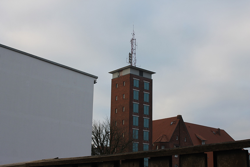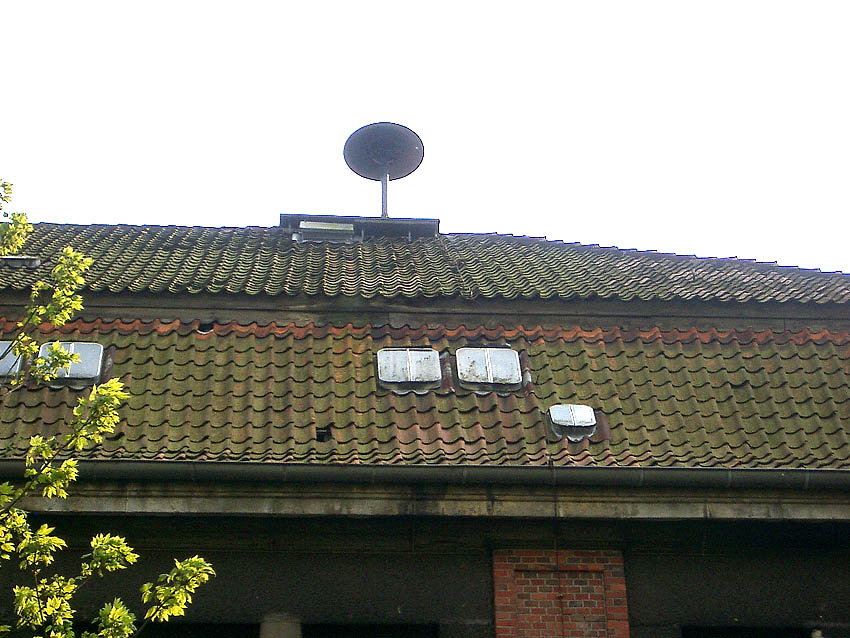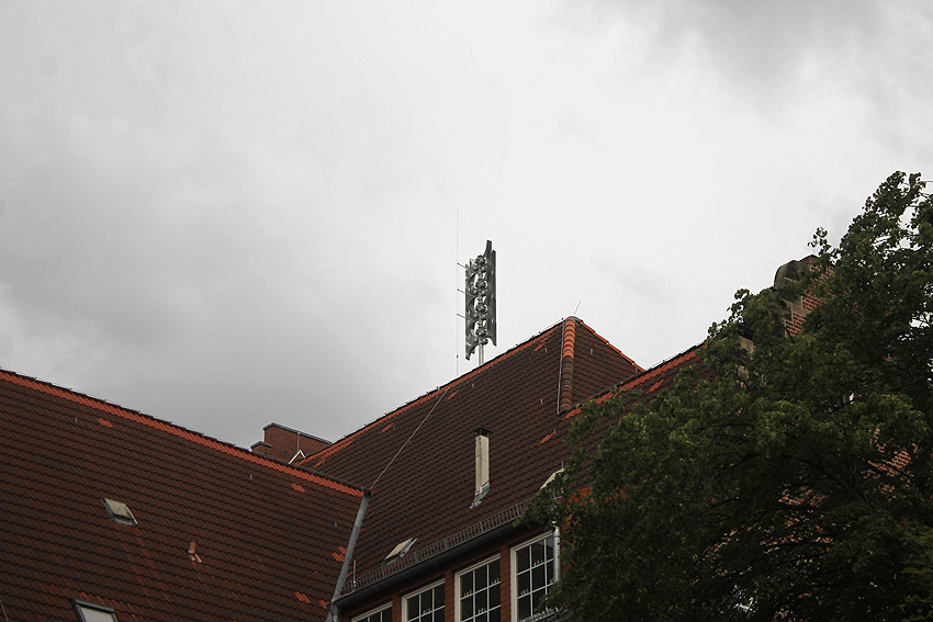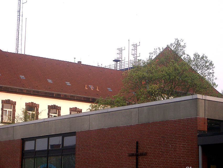 78. Sirene (eventuell Einheitssirene E57) auf dem Dach des Gebäudes Emsstraße 1 / Montierungszeitraum unklar / wohl 1980er Jahre Entfernt / Sirenenhalterung im Westbereich der Giebelspitzenkante vom Gebäude vorhanden