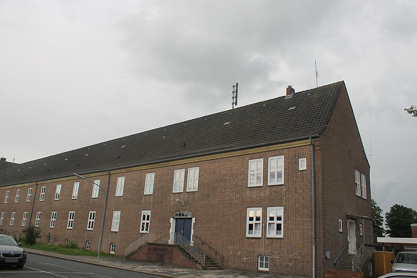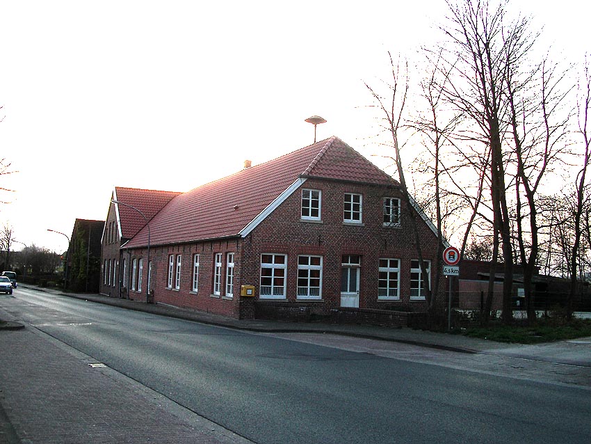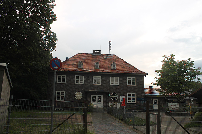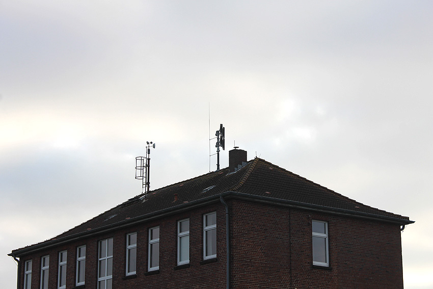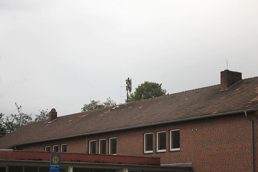 59. Nachkriegs-Sirene (Einheitssirene E57) auf dem Dach der ehemaligen Schule Antonslust (ursprünglich Außengebäude der Marine-Nachrichtenstelle Langewerth / eventuell Originalstandort von Ursprungssirene / wohl 1980er Jahre Entfernt / Sirenenhalterung im Mittelbereich der Giebelspitzenkante vom Gebäude vorhanden / eventuell Ursprungs-Sirenenhalterung