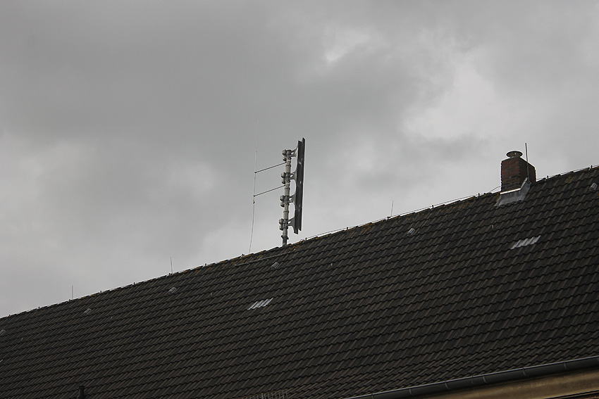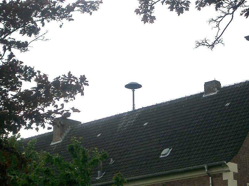 16. Sehr wahrscheinlich Sirene (Einheitssirene E57) mit Halterung aus dem WK 2 auf dem Dach eines Mehrparteienwohnhauses am Europaring / hier neu montiert Vorhanden