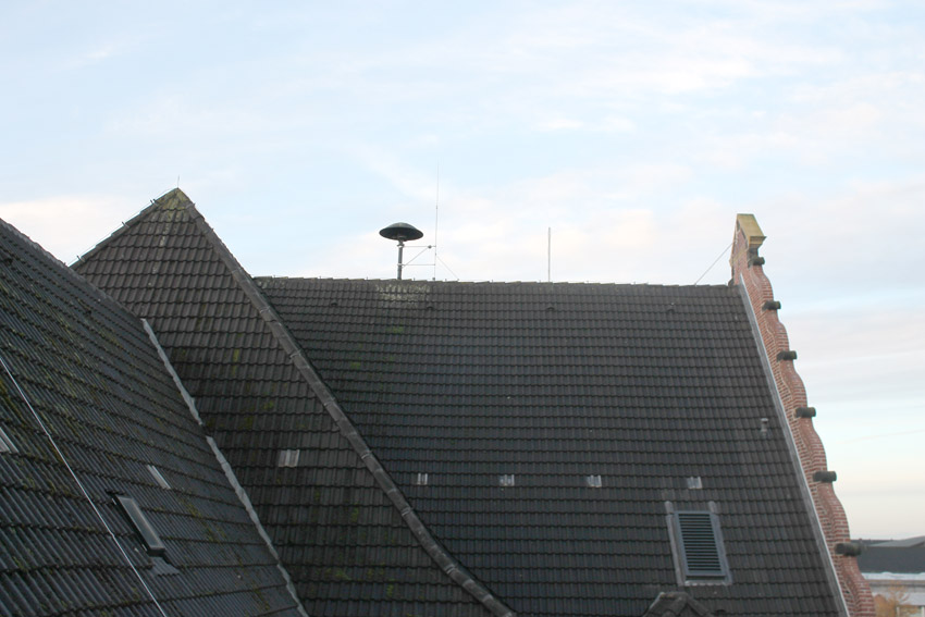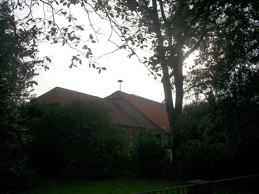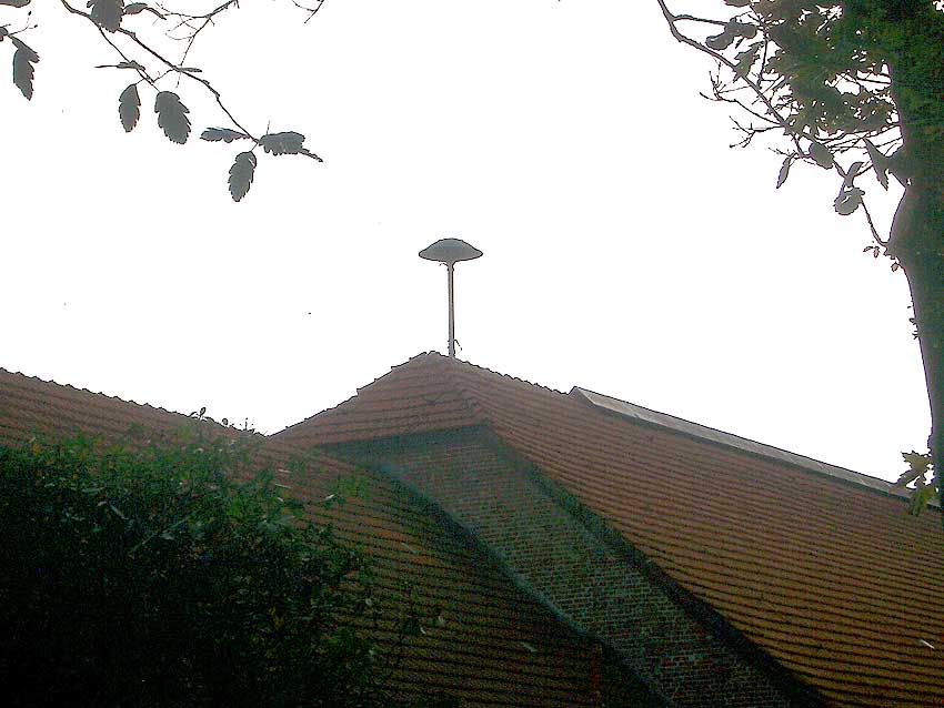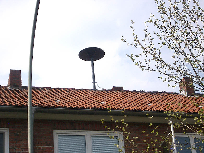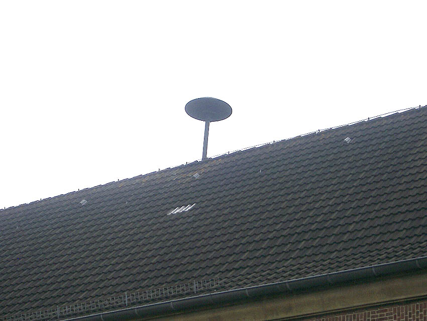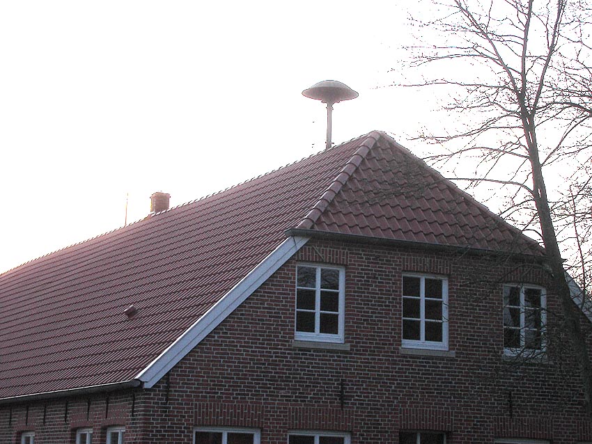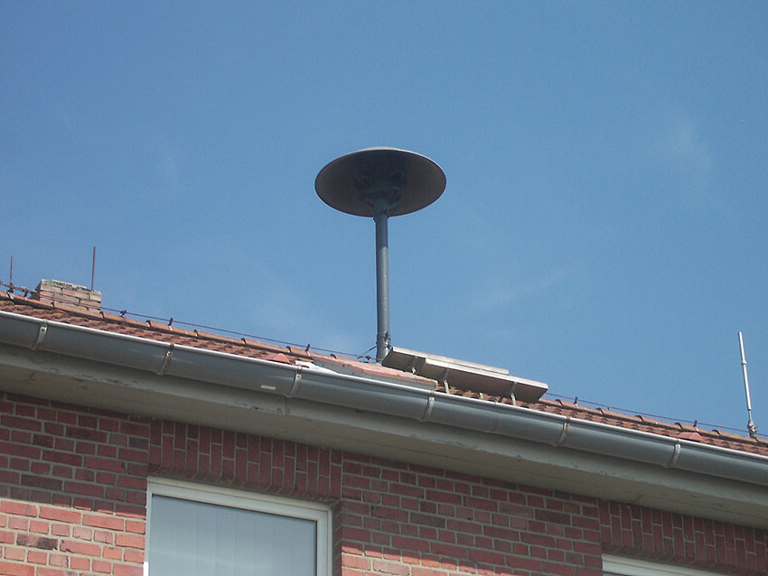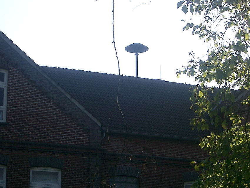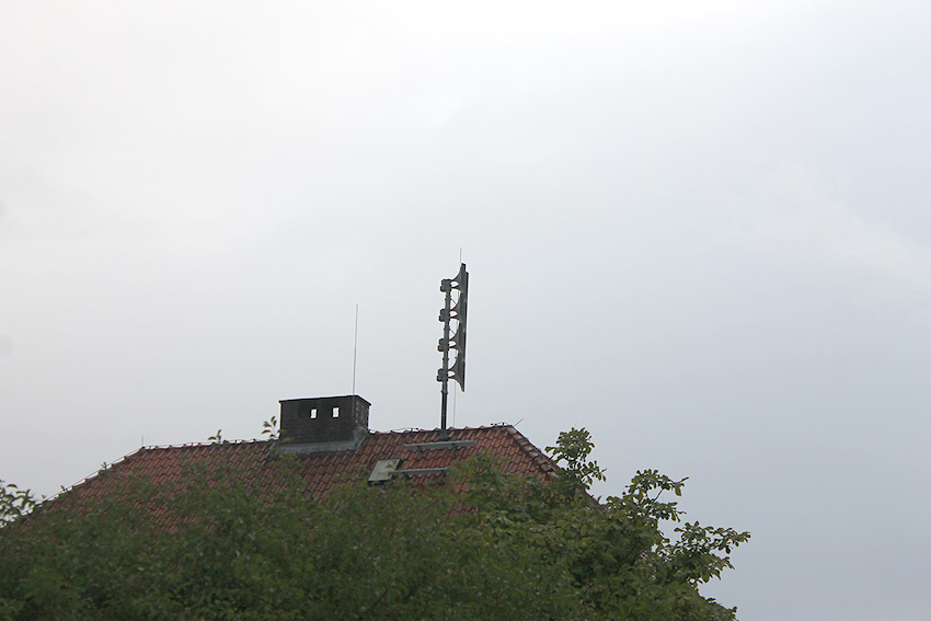 77. Kein Foto: Nachkriegs-Sirene (Einheitssirene E57) auf dem Dach des Gebäudes der ehemaligen Marine-Nachrichtenstelle in Langewerth / eventuell Originalstandort von Ursprungssirene / wohl 1980er Jahre Entfernt