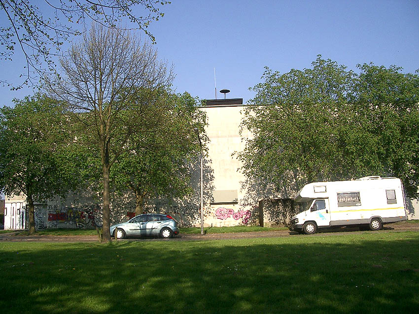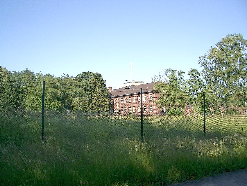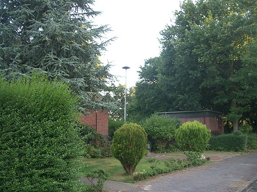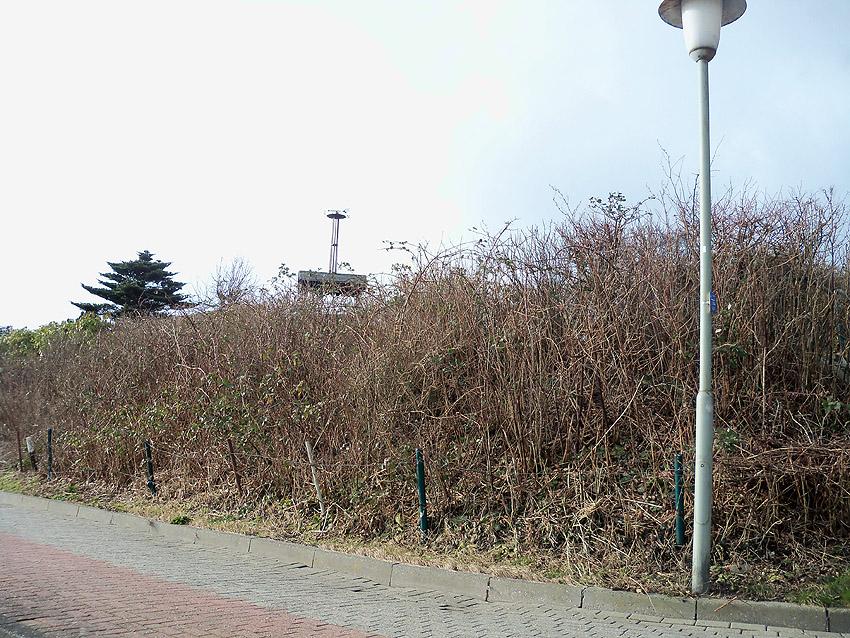 Dies war das ehemalige Pumpwerk / Trinkwasser-Zisterne am Anton-Dohrn-Weg aus Nordwesten gesehen. Noch heute befindet sich dort wie erwähnt eine (mit Kleingärten überbaute) erhöhte, rechteckige Fläche. Einige Betonwandbereiche sind zu erkennen. Wie auf dem oberen Bild aus der frühen Nachkriegszeit zu sehen ist, verfügte die Anlage über zwei massive Eingangsbauten mit Flankenschutz an der Nordseite, westlich und östlich. Eventuell bestanden die Bauten aus Beton. Auf der Erhöhung zu sehen vertikale Luftschächte. Auf der Erhöhung das ehemalige Pumpwerksgebäude mit WK 2-Sirene. War diese Anlage verbunkert, beziehungsweise - diente sie sogar als Behelfs-Personenluftschutzraum?