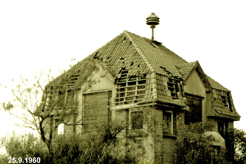 Dieses Bild von 1943 zeigt Splitterschutzvorbauten der Notausstiege und äußeren Eingänge am Gebäude der Funkpeilstation für den dahinter liegenden LS-Keller im Halbkellergeschoss. Die Vorbauten wurden bald nach dem Krieg wieder abgebrochen. Die Sirene ist hier auf dem Dach augenscheinlich zu dieser Zeit noch nicht vorhanden gewesen. Sie wurde jedoch noch im Krieg montiert.