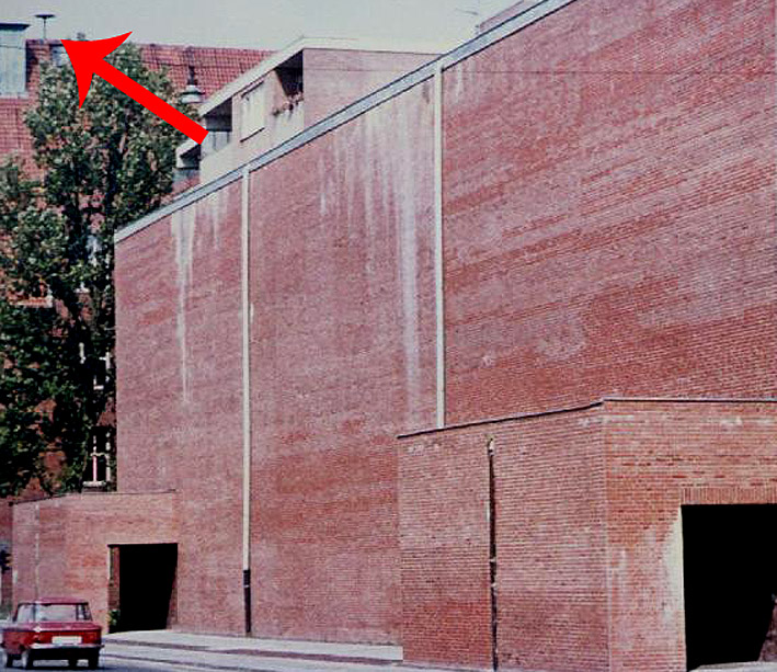 In den 1980er Jahren befand sich die Sirene direkt auf der Giebelspitze des erhöhten Daches des Gebäudeteils hier rechts vom jetzigen Standort. Die Halterung befand sich am erkennbaren hellen Bereich an der Giebelspitze. Wann die Sirene ummontiert wurde, ist unklar. - Zudem befand sich in dem Bereich im Krieg eine Sirene anderer Bauart. Siehe dazu Position 89.