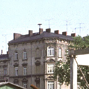 87. Kein Foto: Nachkriegs-Sirene (Einheitssirene E57) auf dem Dach des Mehrparteienwohnhauses Tilsiter Straße 31 / Jadeviertel / eventuell Originalstandort von Ursprungssirene / wohl 1980er Jahre Entfernt