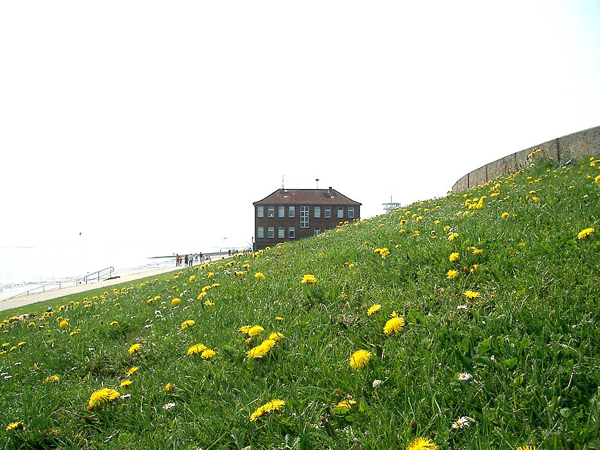 57. Nachkriegs-Sirene (Einheitssirene E57) auf dem Dach des mittleren Kasernengebäudes am Südstrand / Fliegerdeich / eventuell Originalstandort von Ursprungssirene / bis Ende 1990 nachweisbar noch vorhanden gewesen / wohl späte 1990er Jahre Entfernt