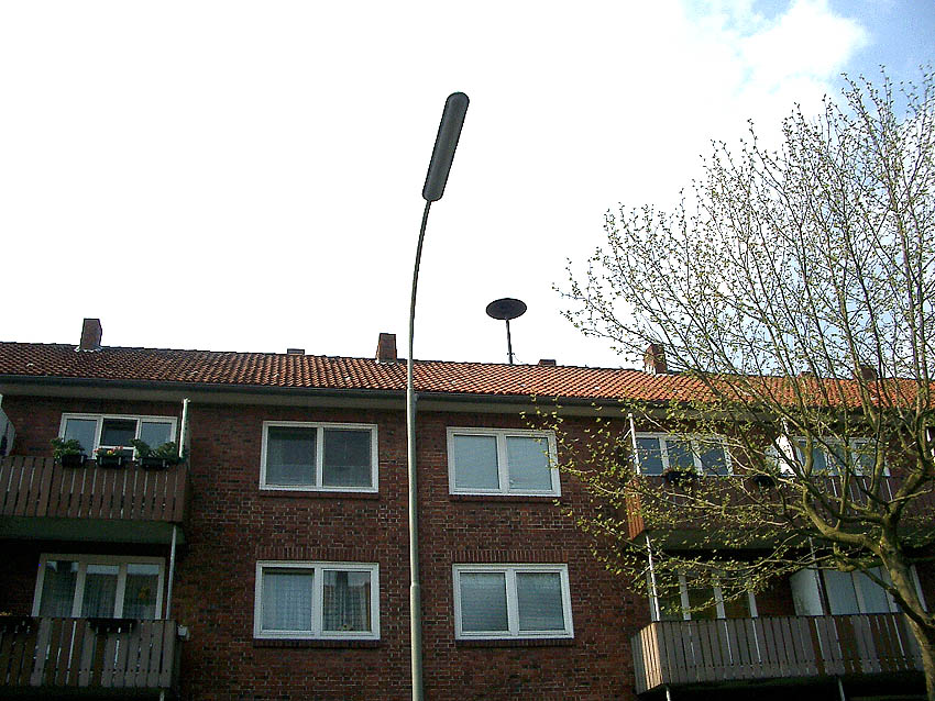 73. Kein Foto: Nachkriegs-Sirene (Einheitssirene E57) auf dem Dach eines Mehrparteienwohnhauses an der Beethovenstraße Höhe Mündung Regerstraße / Altengroden-Süd / hier neu montiert / wohl 1980er Jahre Entfernt