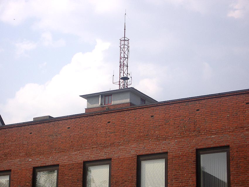 ?. Kein Foto: Nachkriegs-Sirene (Einheitssirene E57) auf dem Dach der Südzentrale / Aufbau Nebengebäude / eventuell Originalstandort von Ursprungssirene / wohl 1960er Jahre montiert / 1995 oder nach 1995 Entfernt / Nachkriegs-Sirenenhalterung auf dem Aufbau vom Nebengebäude vorhanden