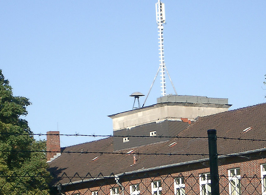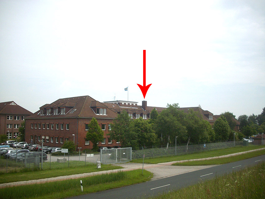 93. Kein Foto: Nachkriegs-Sirene (Einheitssirene E57) mit hoher Dreifachmast-Halterung auf dem Dach (nahe südliche Dachkante) des Kommandogebäudes an der Endrasstraße im Marinestützpunkt / 4. Einfahrt / eigenständige Sirene der Bundeswehr für Stützpunktbereich / hier neu montiert / wohl 1990er Jahre Entfernt