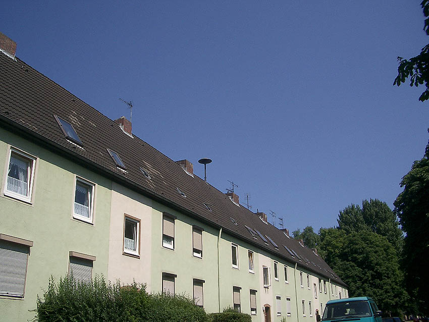 83. Kein Foto: Nachkriegs-Sirene (Einheitssirene E57) auf dem Dach des Wohnhochhauses Borkumstraße Ecke Heppenser Straße / hier neu montiert / wohl 1980er Jahre Entfernt