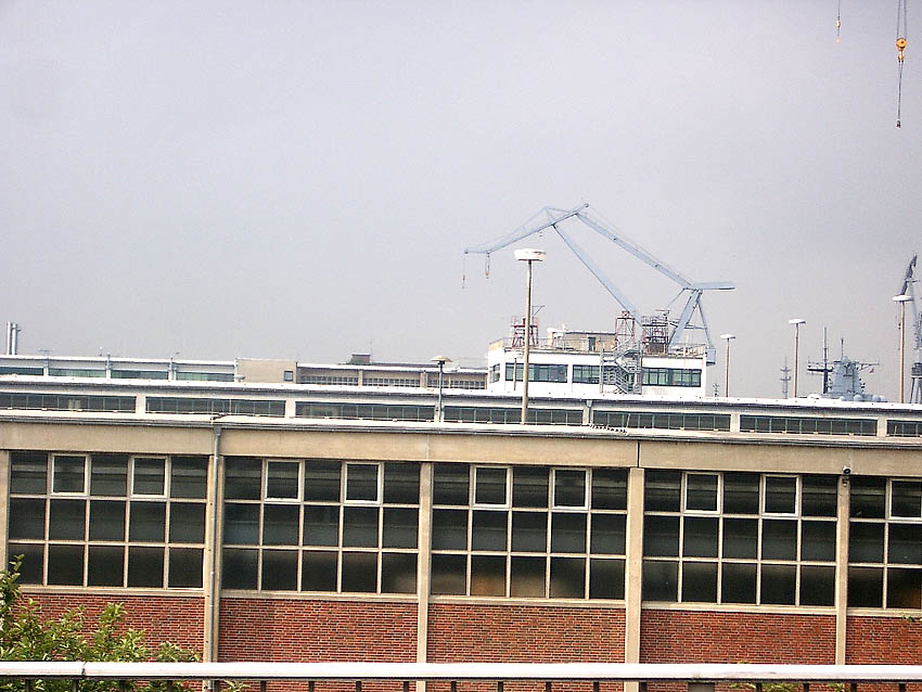 96. Kein Foto: Nachkriegs-Sirene (Einheitssirene E57) auf dem Dach des Marinearsenalgebäudes Schiffbauhalle / Basalanhalle (bei der ehemaligen Tirpitz-Helling) nördlich Tor 1 gegenüber Gökerstraße Ecke Peterstraße / eigenständige Sirene der Bundeswehr für Arsenalbereich / hier neu montiert (wohl 1980er Jahre / eventuell für unweit des Standortes demontierte Nachkriegssirene E57) Vorhanden