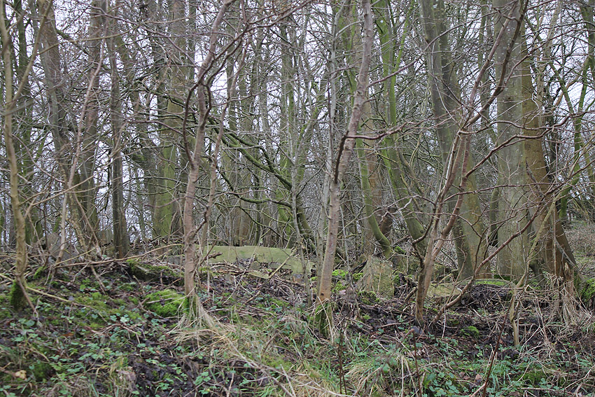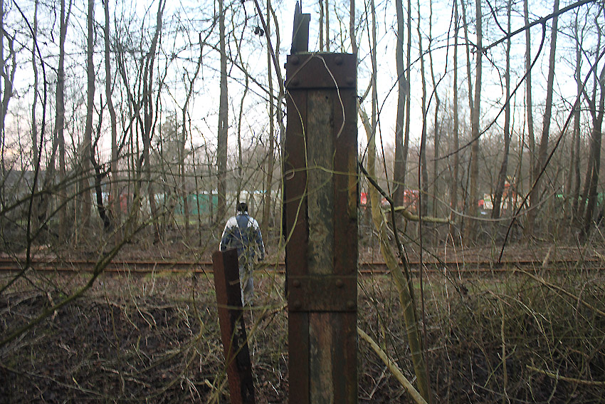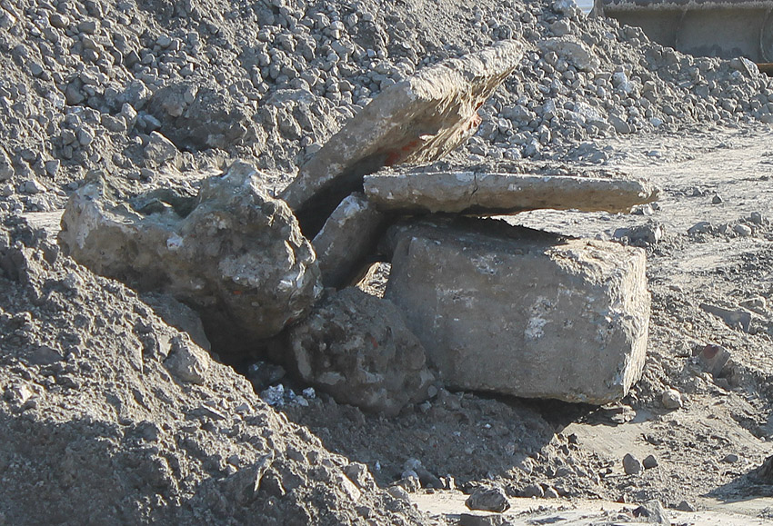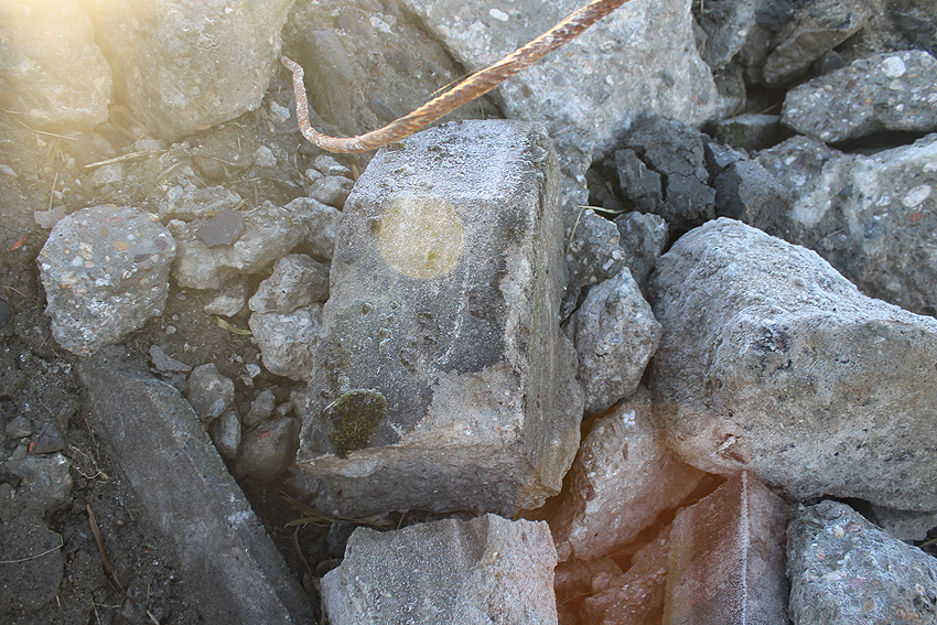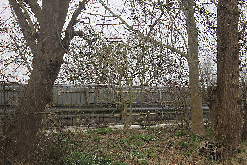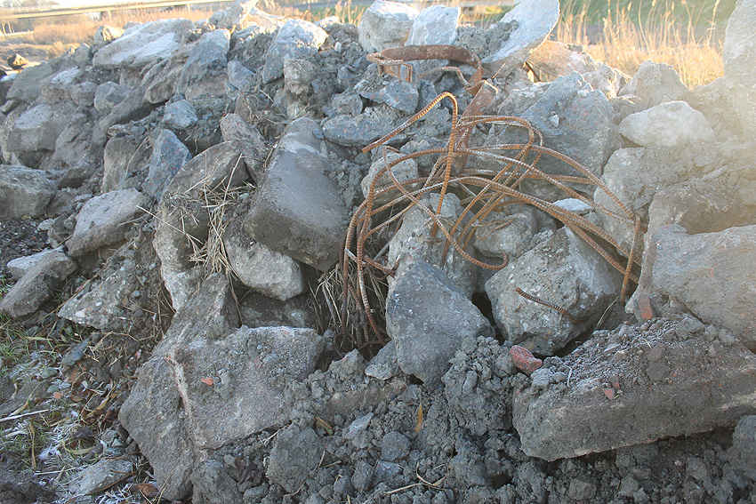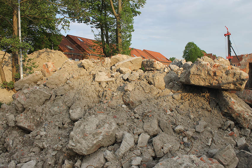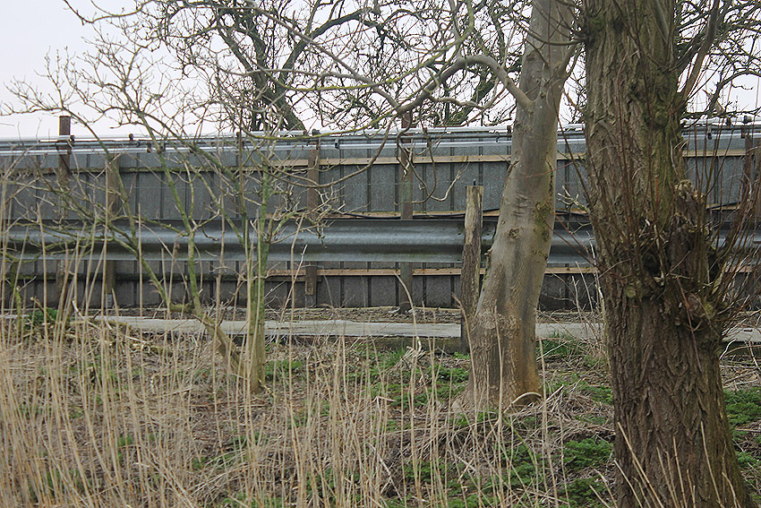 An der Bahnstrecke von Sande in Richtung Esens, einige Meter nordwestlich der Autobahnbrücke der A 29 westlich der K 294 (Neu Abbickenhausen) befanden sich diese im Herbst 2016 aufgeschobenen Betontrümmer. Sie wurden im Frühjahr 2017 großteilig abgefahren. Befand sich hier eventuell eine verschüttete LS-Anlage (Reichsbahndeckungsgraben?) oder stammen die Trümmer von einer alten Bahnbrücke über die Maade? Hier fanden umfangreiche Bauarbeiten an der Bahnstrecke statt, unter anderem eine Erneuerung der Brücke. Die Trümmer sehen jedoch sehr alt aus.