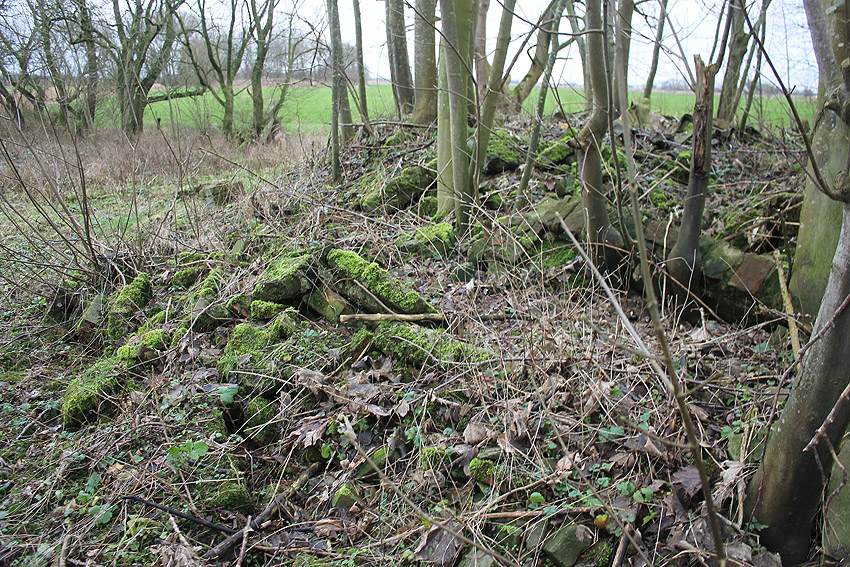 In Bohnenburg südlich von Hooksiel befinden sich an der Bohnenburger Reihe diverse Trümmer. Teilweise aus Beton, teilweise aus Mauerwerk. Diese historische Straße war eine der Zuwegungen zum nicht mehr existenten Dorf Inhausersiel, welches in den 1970er Jahren aufgrund Industrieansiedlung abgerissen wurde. Auch an der Bohnenburger Reihe standen Gehöfte, die teilweise für dieses Vorhaben mit abgebrochen wurden. Auf dem Gelände des ehemaligen Hofes Nr. 12 befindet sich ein kleines Trümmergebiet mit zwei markanten, sehr massiven Schornsteinen, welche umgekippt sind. Zudem sind Stahlträger im Bereich einer eingestürzten Decke zu sehen. Solche Schornsteine sind auch als Lüftungstürme von Splitterschutz-Luftschutzbauten weit verbreitet realisiert worden. Könnte es sich bei den Trümmern um einen zerstörten Deckungsgraben mit Wänden großteilig aus Mauerwerk handeln? Nachtrag 09.01.18: Ist dies lediglich ein einzelner, durchbrochener Schornstein? Hier sollen seinerzeit Einfamilienhäuser gestanden haben. Nach Hinweisen soll hier "kein Bunker existiert haben. Ein Bunker stand in Inhausersiel, zwei weitere in Richtung Voslapp nach Süden hin". In der Frieslandtabelle sind drei Bauwerke - in Inhausersiel (2) / bzw. Pütthausen (1) - vermerkt. Wir bleiben weiter dran.