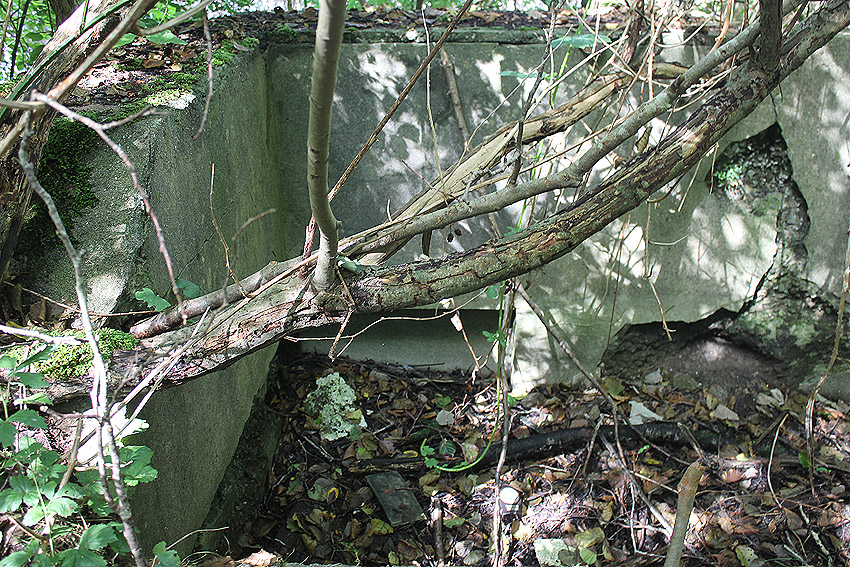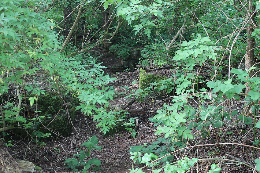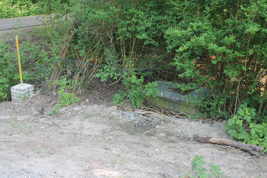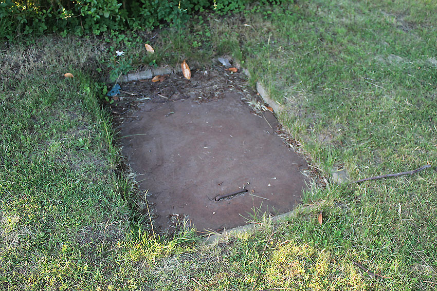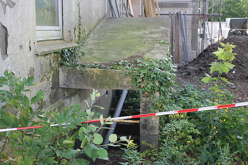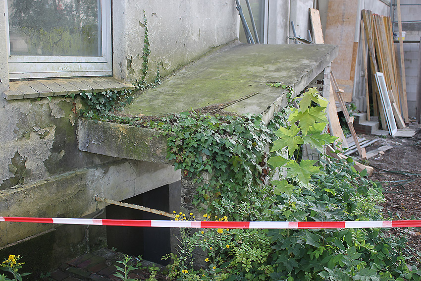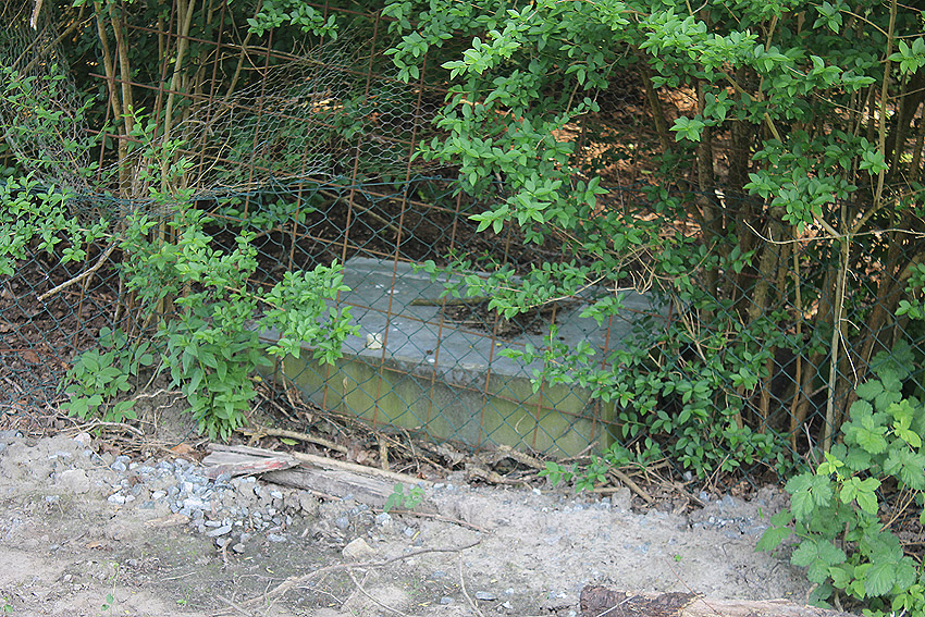 Westlich daneben am Gebäude Nummer 5B jedoch ist ein Betondeckel / bzw. eine Betonplatte auf einem Schacht vorhanden. War dies eventuell ein Notausstieg mit (Kriech)Gang zu einem LS-Keller im Gebäude?