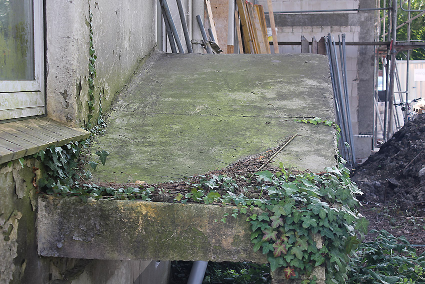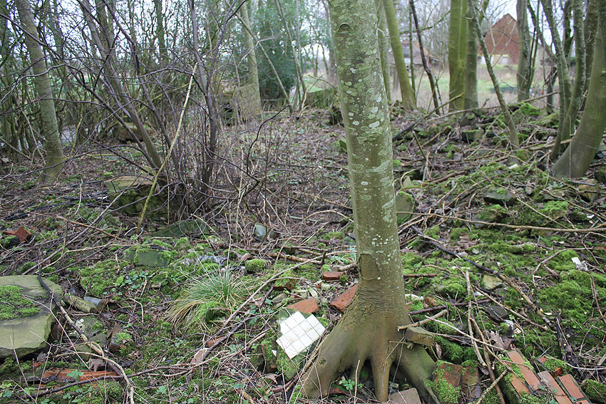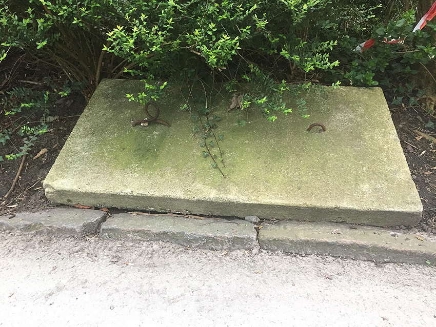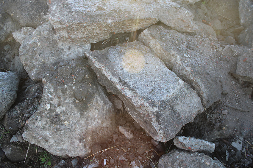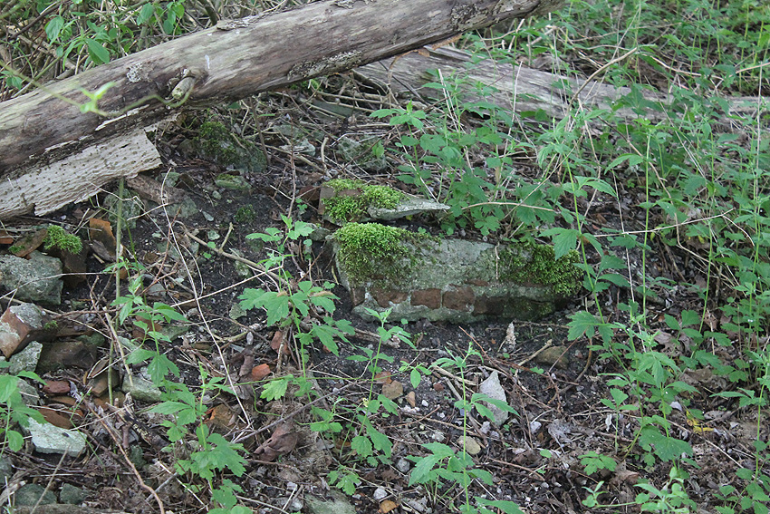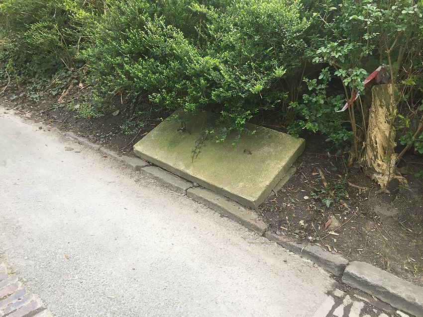 Westlich daneben am Gebäude Nummer 5B jedoch ist ein Betondeckel / bzw. eine Betonplatte auf einem Schacht vorhanden. War dies eventuell ein Notausstieg mit (Kriech)Gang zu einem LS-Keller im Gebäude?