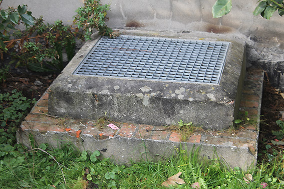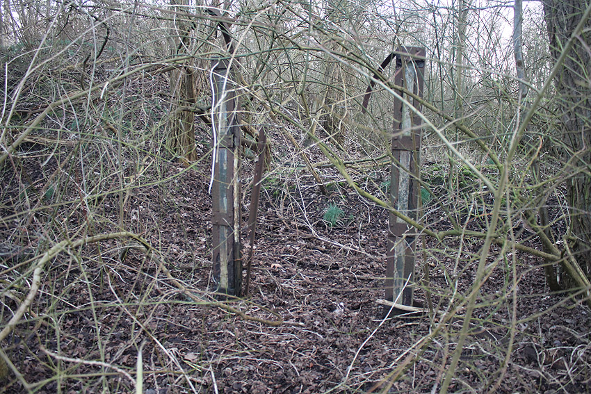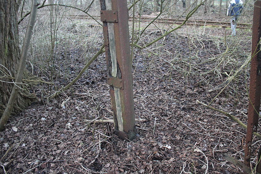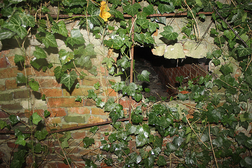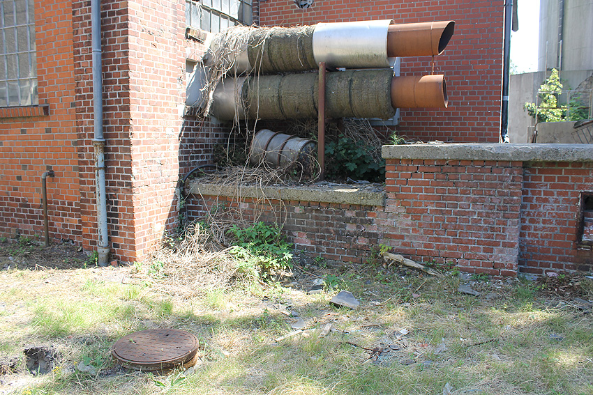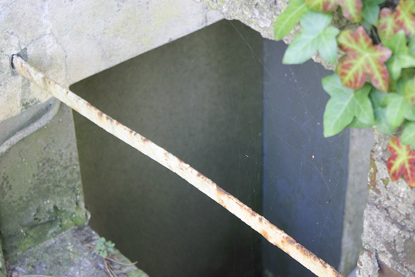 Westlich des ehemaligen KSW-Hauptgebäudes befindet sich dieses Objekt mit Stahlrahmen und rundem Schacht. War dies ein Notausstieg einer LS-Anlage? Anliegend befand sich ehemals ein runder Tank.