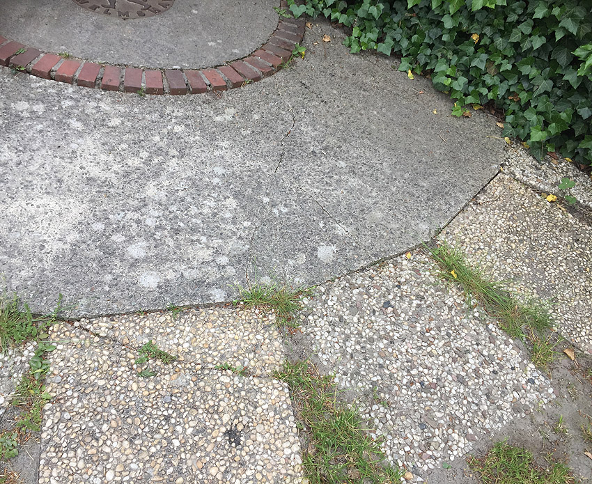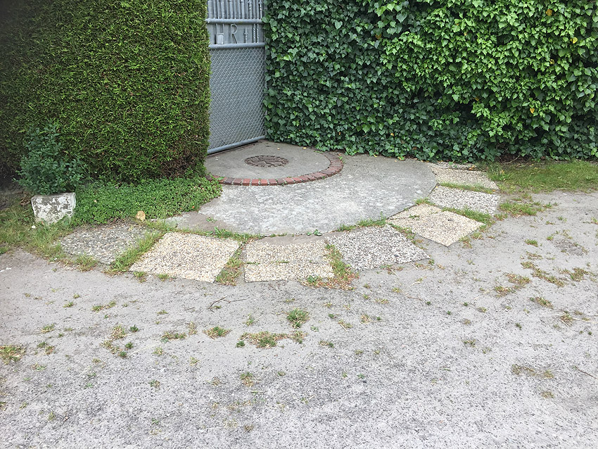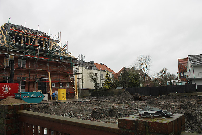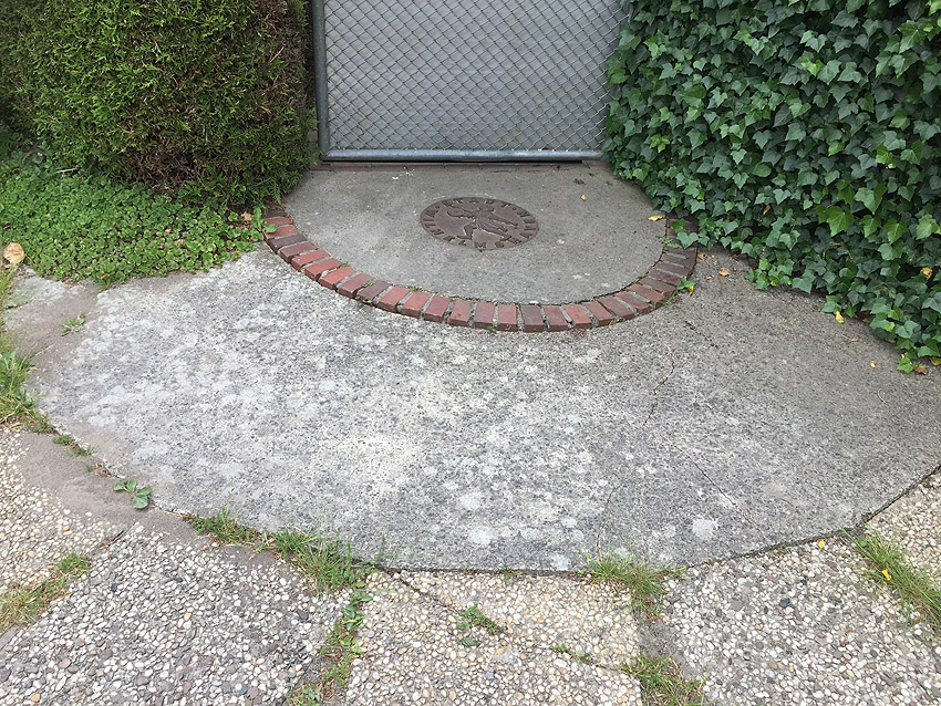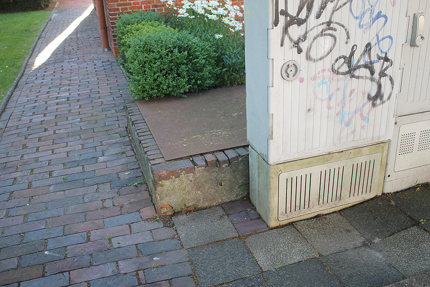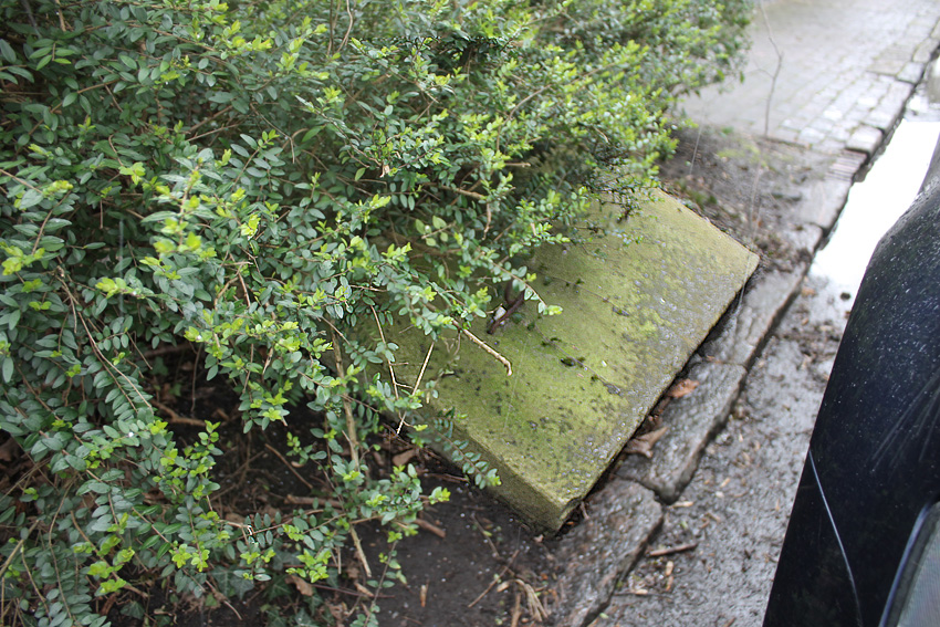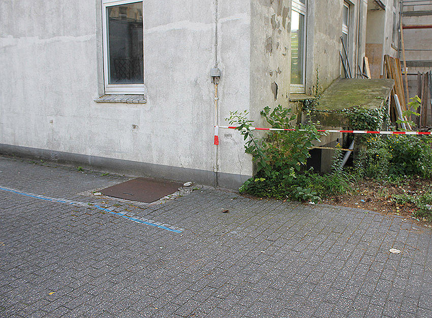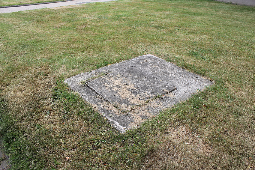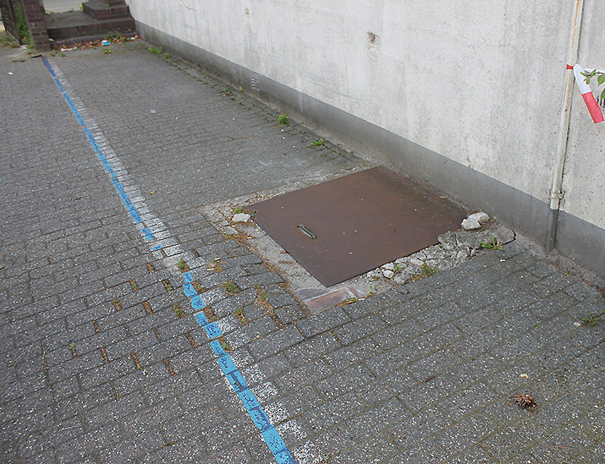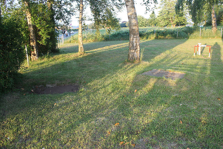 Emsstraße: Östlich des ehemaligen Gebäudes, an welches der dortige ebenfalls abgerissene Bunker westlich angesetzt war, befinden sich noch immer eine Betonplatte und eine Stahlklappe. Was war das? Ein Brunnen? Eine Verbunkerung?