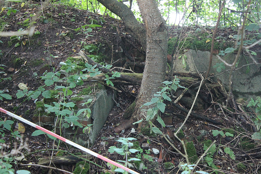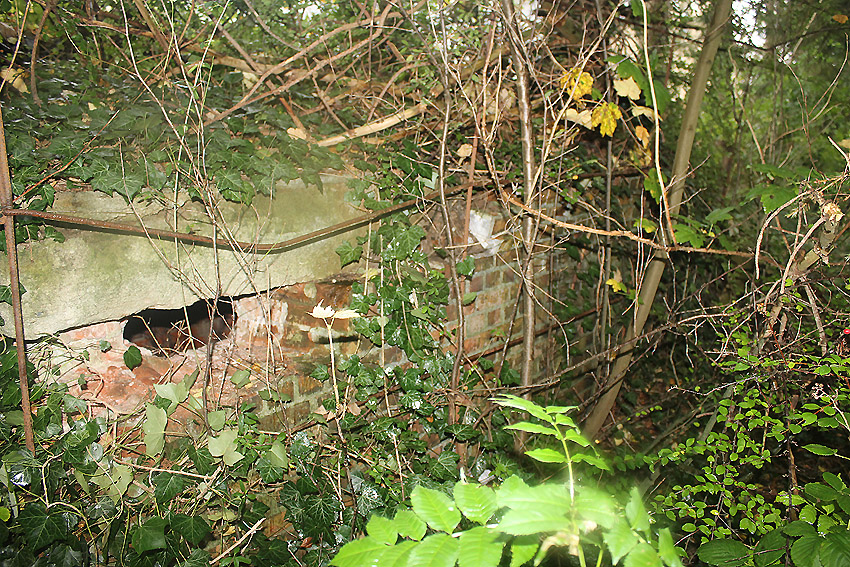 Hinter dem ehemaligen Kiosk an der Hauffstraße 2B, unweit entfernt vom Rundschutzbau Allmersstraße, befindet sich dieses gemauerte Objekt. Obwohl nur zwei Seiten komplett einsehbar sind, ist es in sich geschlossen. Die Tür dürfte sich an der Nordseite befinden. Nach Hinweisen soll dies ein Behelfsluftschutzbau sein. Wer hat Informationen?