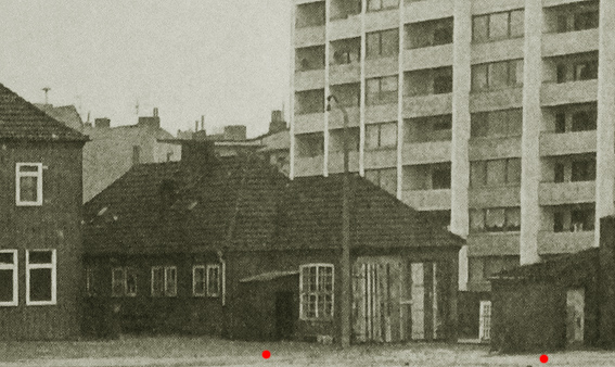 Blick von der Kirchreihe nach Norden. Ganz im Hintergrund der noch relativ niedrige Baumbestand vom Stadtpark. Links wieder der vermutete Scheinwerferstandturm. Rechts eventuell sogar der Munitionsbunker, der dann ebenfalls noch vorhanden gewesen wäre, also dann nicht 1945 mit den anderen Anlagen gesprengt wurde. Dies ist jedoch eher unwahrscheinlich. Offenbar hatte das Objekt hier aber kein Spitzdach (mehr) (der Mun.-Bunker besaß aus Tarnungsgründen ein solches). Dieses wird im Falle der Bestätigung dann bereits eher entfernt worden sein. Es wäre auch möglich, dass diese Aufnahme nach Westen zeigt und im Hintergrund rechts die Funkpeilstation am Totenweg erkennbar ist. Dann hätten die Objekte wiederum nichts mit der Flakstellung zu tun gehabt. Das Objekt im oberen Bild wäre dann wohl auch nicht der Scheinwerferstand gewesen: