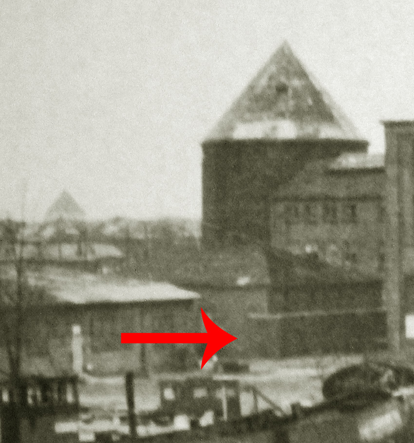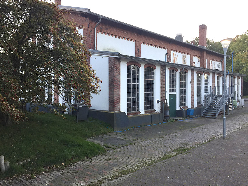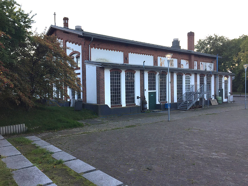 Hinweis: Das Gebäude, welches ein Pumpwerk für die darunter liegende Trinkwasser-Zisterne darstellte, war nahezu identisch zum noch heute vorhandenen Pumpwerksgebäude "P1" (Pumpwerk 1) an der Kaiser-Wilhelm-Brücke: