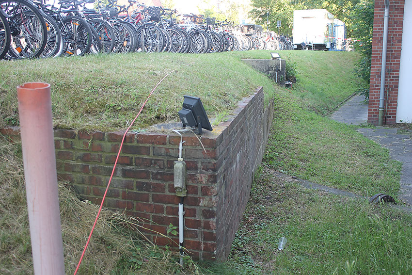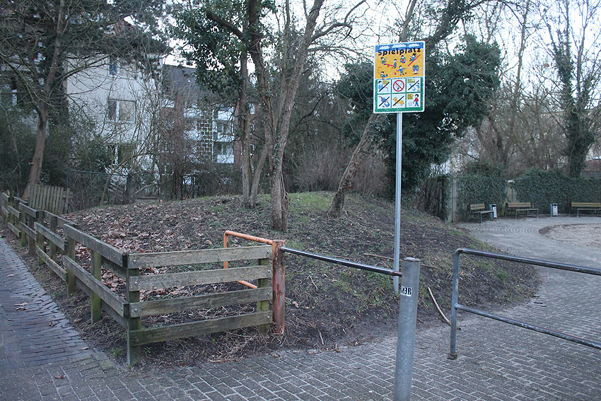 Interessant ist diese Erdaufschüttung am Spielplatz an der Weserstraße östlich der Gebäudenummer 67. Der ersichtliche Kanaldeckel ist auf einem erhöhten Schacht angelegt. Warum geschah das hier? Auch LS-Splitterschutzbauten besaßen nicht selten solche Kanalschächte (mit Kanaldeckeln) als Notausstieg. Beispiel - Splitterschutzbunker in Sillenstede: