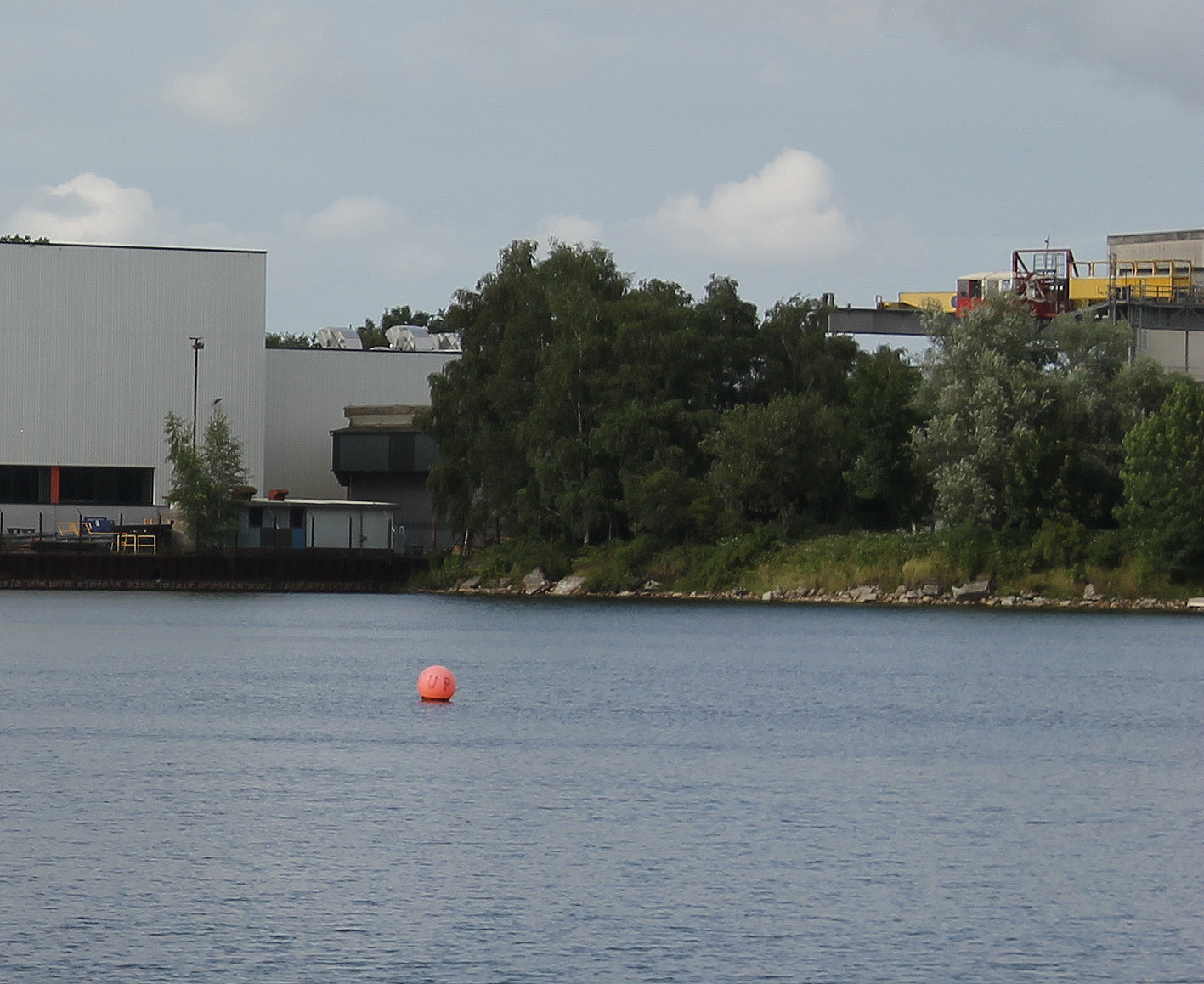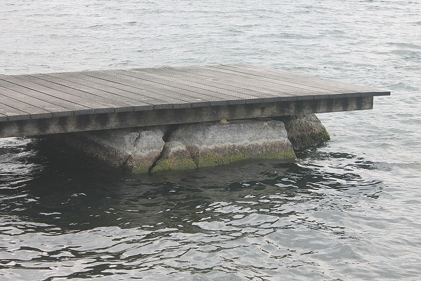 Mit zwei Schildern gekennzeichnete Untiefe im Süd-Mitte-Bereich vom Banter See. Die im Gittermuster erstellte Stahlbetonkonstruktion einer Schwerlast-Abladefläche für Schiffsfracht ist hier noch immer unmittelbar unter Wassergleiche in deren Ostbereich vorhanden. Ursprünglich erstreckte sie sich noch ein ganzes Stück weiter nach Westen. Sie befand sich genau an / in der ehemaligen Uferkante / bzw. Kais des damaligen Hafens. So sieht man heute, wie durch die späteren Demilitarisierungen die Uferkante weiter nach Süden gerückt ist. Fertig gestellt wurde die Abladefläche wohl nicht gänzlich, da sie zum Kriegsende noch immer keine Abschlussdecke erhalten zu haben schien. Der erhaltene Bereich der Konstruktion ist zudem nach Westen hin abgesackt, daher ist der Ostbereich näher and der Wasseroberfläche und vor allem auf Luftbildern gut erkennbar. Die Konstruktion wurde nach Kriegsende teilgesprengt. Etwas weiter nördlich davon: