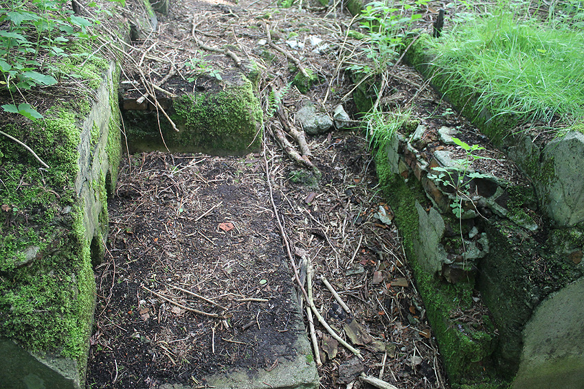 Nördlich gegenüber der Roffhauser Landstraße 41 in Langewerth Richtung Roffhausen befindet sich dieser Viehunterstand mit Laufgang. Der Boden ist betoniert. Auf einem 1945er Luftbild ist hier bereits ein längliches Objekt erkennbar. Sind dies eventuell Reste eines betonierten Deckungsgrabens unter Erdgleiche, dessen Eingangsbereiche abgebrochen, bzw. zugeschüttet wurden?