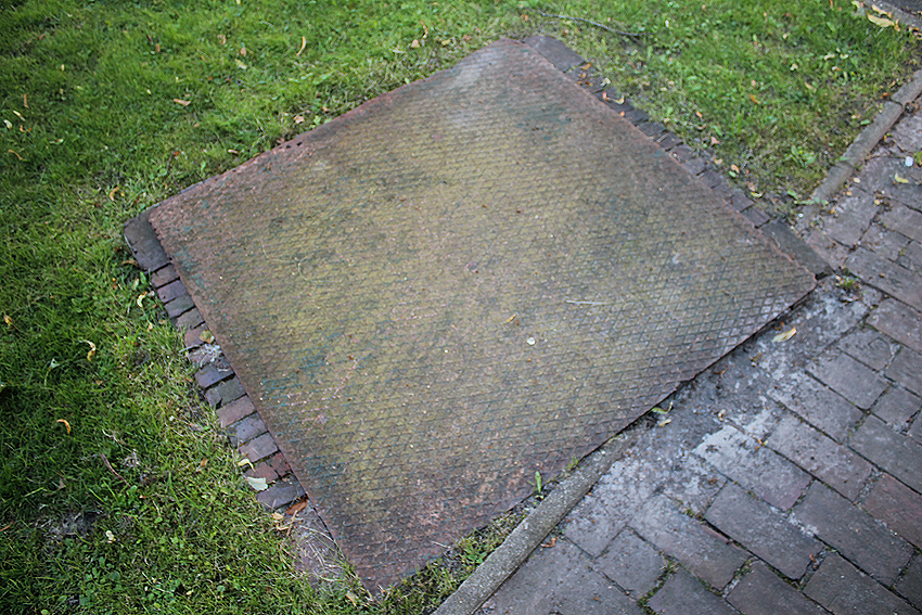 Am Gebäude Ölhafendamm 7 befindet sich diese Stahlklappe auf einem Schacht. Wohl zur Versiegelung einer Zisterne (?).