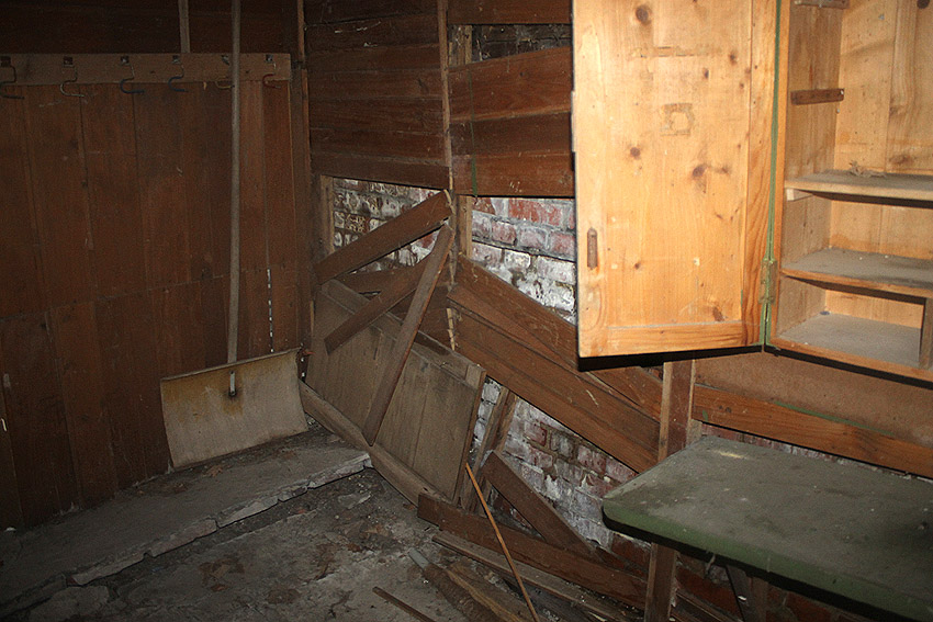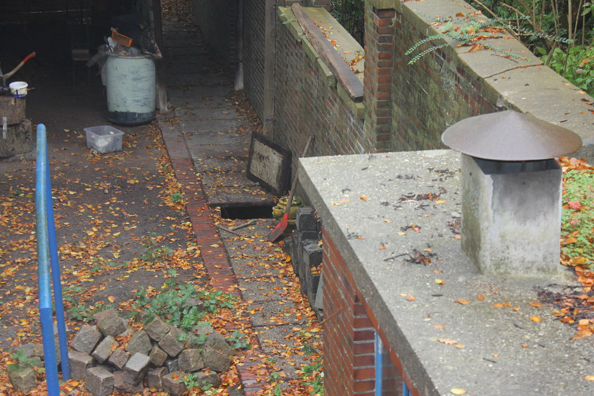 Westlich des ehemaligen Feuerwachengebäudes befindet sich dieser Unterstellraum mit Massivdecke (wohl ein Nachkriegsbauwerk) und darunter / daneben ein abgedeckter Kanal, wie er auch direkt am Hauptgebäude entlangführend vorhanden ist. Er zieht sich hin in Richtung zur ehemaligen Westwerft nebenan. Verliefen hier Löschwasserschläuche zum Befüllen der Einsatzfahrzeuge vom und zum nahen Feuerlöschteich auf dem heutigen "Helmholtzplatz"? War der Kanal aufgrund von Splitterschutzzwecken mit diesen Platten überdeckt?