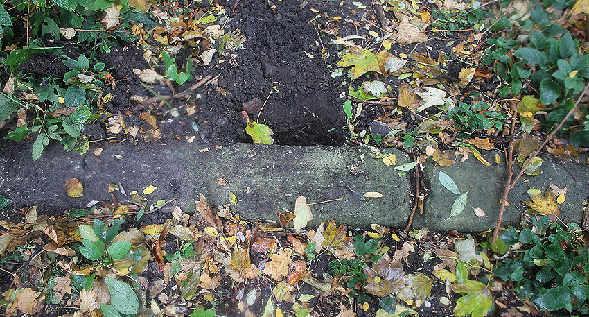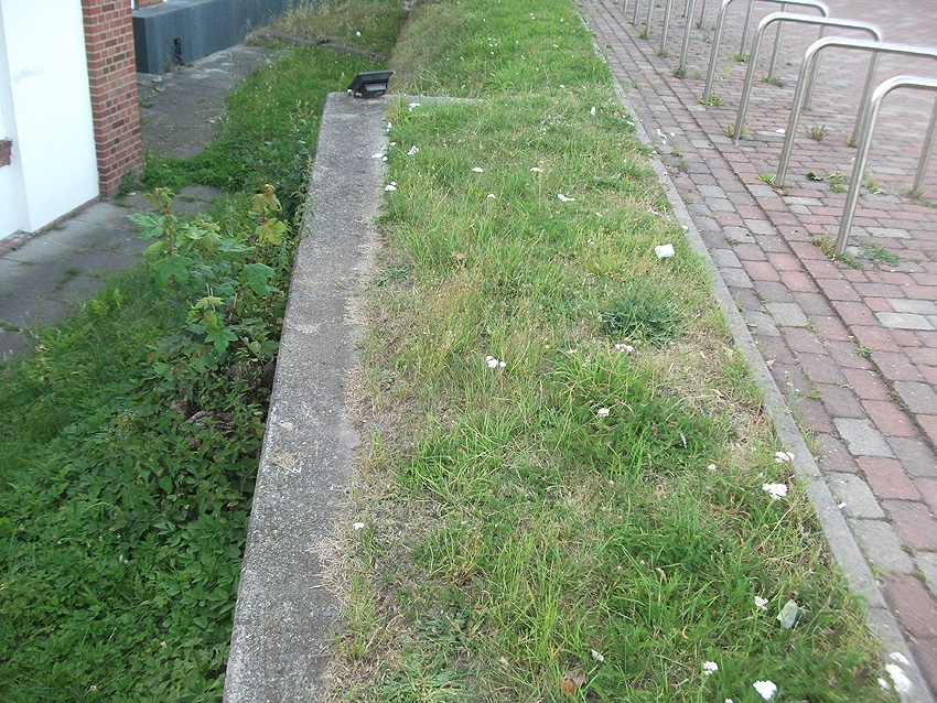 Östlich des Gebäudes Banter Deich 8 befindet sich diese rechteckige Betonplatte. Dahinter eine relativ flache Erdauschüttung. Ist dies eventuell der Notausstieg eines vormals überbauten Luftschutzkellers / bzw. unüberbauten Erdschutzraumes? 1945 ist an der Stelle eventuell ein kleines Gebäude im Schatten von Hausnummer 8 zu sehen, oder eine Erdaufschüttung über dem Schutzraum. Ganz in der Nähe befindet sich mindestens eine weitere ehemalige Luftschutzanlage.