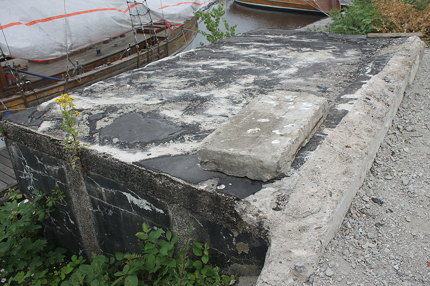 Westlich des Objektes befindet sich dieser Mauerwerksfortsatz am Uferbereich... Im Nordwestbereich der Wiesbadenbrücke befindet sich am dortigen kleinen Seglerhafen dieses massive Mauerwerksblock-Objekt mit Betondecke direkt am Ufer. Bis zum Frühjahr 2018 befand sich hier fast direkt westlich anliegend ein Gebäude, welches im Zuge der Umgestaltung der Wiesbadenbrücke (geplante Neubauten) abgerissen wurde. Es bestand schon 1945 (bzw. eher). Nach dem Krieg wurde in den Bereich des Objektes ein Schuppen gebaut. Auf 1945er Luftbildern ist das Objekt erkennbar mit länglicher Fortsetzung nach Süden hin auf die Wiesbadenbrücke. Bisher war uns dieser Block durch das Gebäude (bzw. den Schuppen) nicht aufgefallen. Was war das? Eine Verbunkerung aus dem Zweiten Weltkrieg? Das westlich davon befindliche Gebäude besaß einen Keller. Bestand hier ein Zusammenhang? Im Block befindet sich eine mit Glasbausteinen verschlossene Öffnung. Ein Notausstieg bzw. Eingang direkt am Wasser würde jedoch wenig Sinn machen.