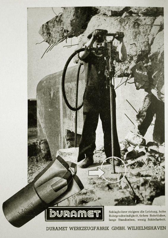 Das ist der nach dem Krieg schnell und zumindest oberirdisch restlos abgebrochene Bunker an der Strandhalle. Hier ist er nach der Sprengung durch die Besatzungsmacht zu sehen. Es kann sein, dass es sich um einen Regelbau im Rahmen des Atlantikwalles / Friesenwalles handelte. Das Foto darüber: Diese Aufnahme integriert in eine lokale Werbeanzeige aus den 1950er Jahren soll den (Regelbau?)Bunker an der Strandhalle während des Abbruches zeigen. Stimmt das? Und was war das für ein Bunker(typ)?