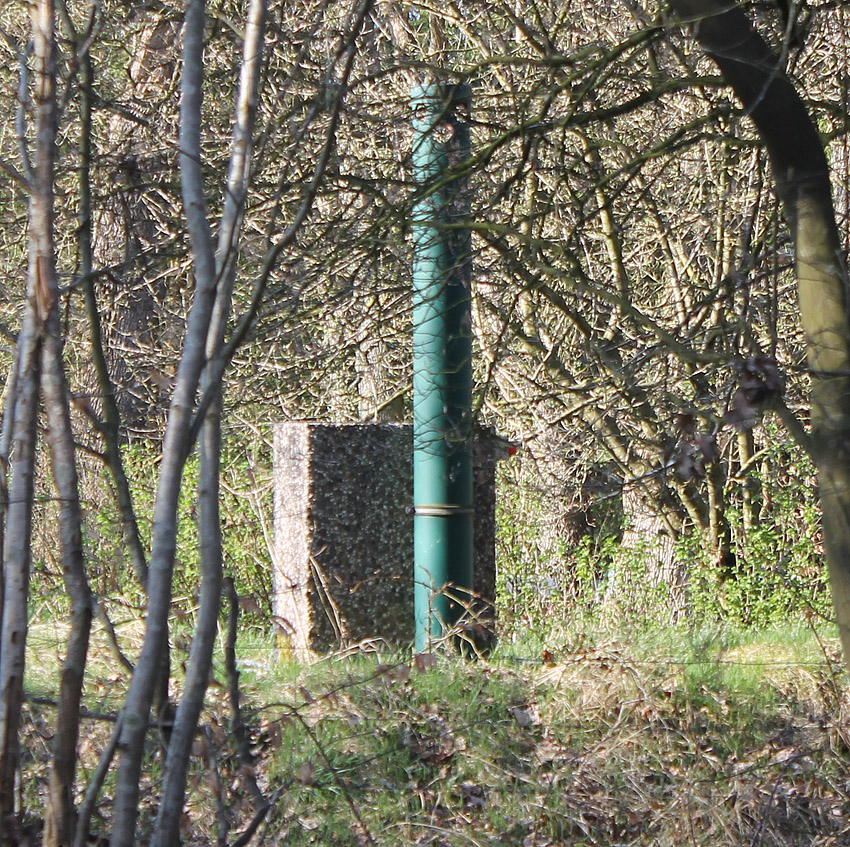 Im Staatsforst Hopels südlich Friedeburg an der Hopelser Straße unweit westlich des Forsthauses befindet sich dieses Objekt auf / in einem kleinen Erdhügel. Obwohl der Betonklotz aus neuzeitigem Waschbeton (ähnlich verwendet z.B. bei Abfahltonnensilos) zu bestehen scheint, fragen wir trotzdem: War dies möglicherweise (ursprünglich) eine Verbunkerung (evtl. Brunnen / Zisterne) aus dem Zweiten Weltkrieg? Denn: Im näheren Umkreis befinden sich gleich mehrere Beobachtungskuben (bzw. Kabelbrunnen).