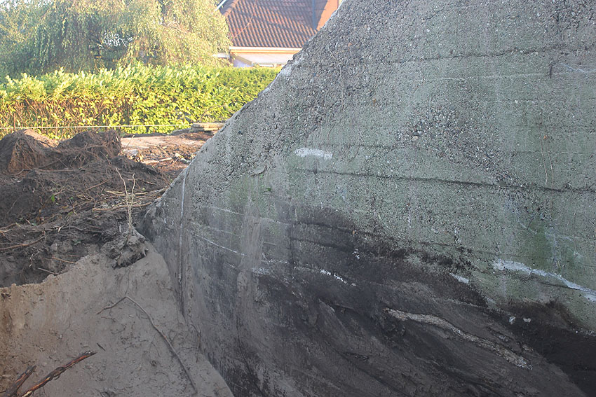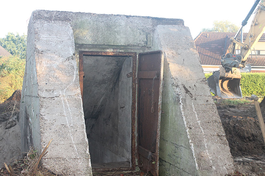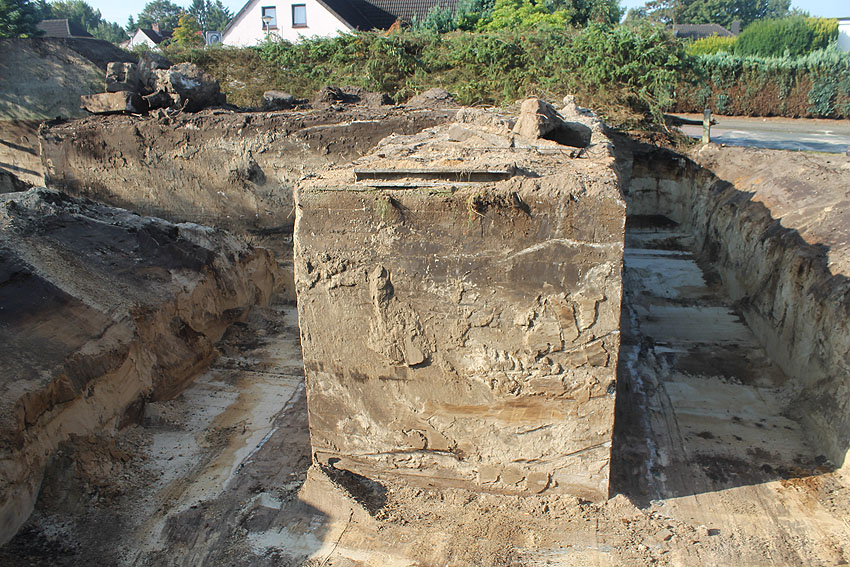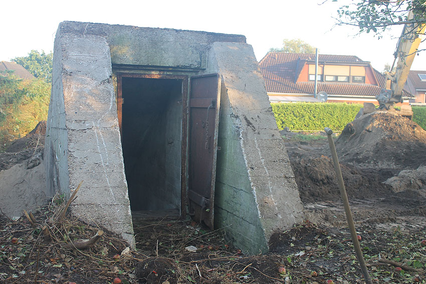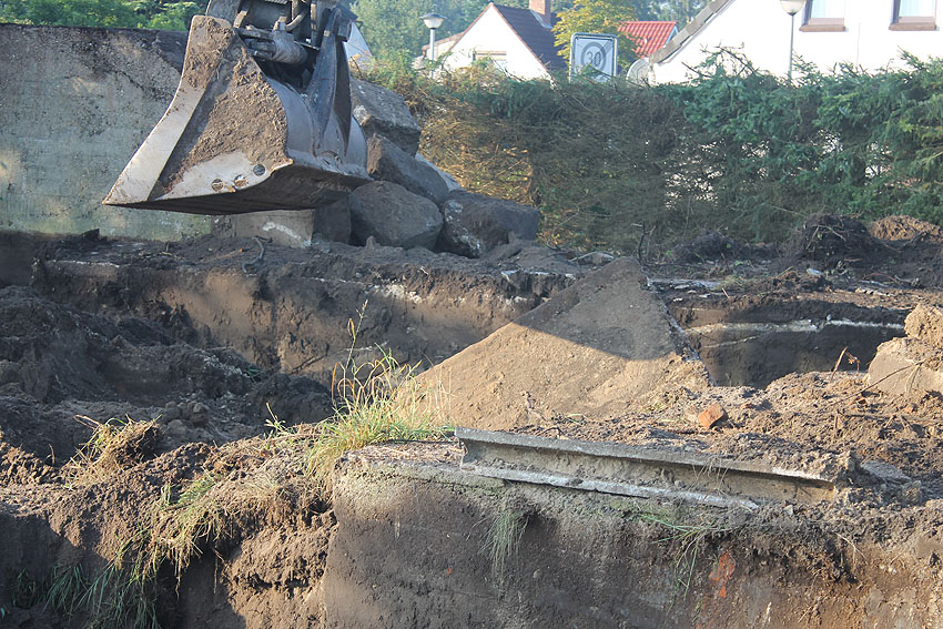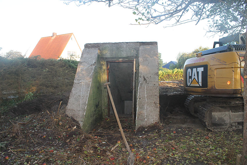 Am 7. und 8. September 2016 wurde nun der betonierte Deckungsgraben an der tom-Brok-Straße Ecke Bahnhofstraße in Schortens / Heidmühle abgerissen. Das Bauwerk konnte beim besten Willen nicht in das geplante Neubauvorhaben (Einfamilienwohnhaus) integriert werden und musste deshalb leider weichen. Der Abbruch erfolgte durch die Firma Swyter GmbH aus Jever. Wir hatten die Gelegenheit, den Abbruch ausführlich zu dokumentieren. Unser herzlicher Dank an den Eigentümer des Grundstückes, Herrn Bruns, für die Ermöglichung!