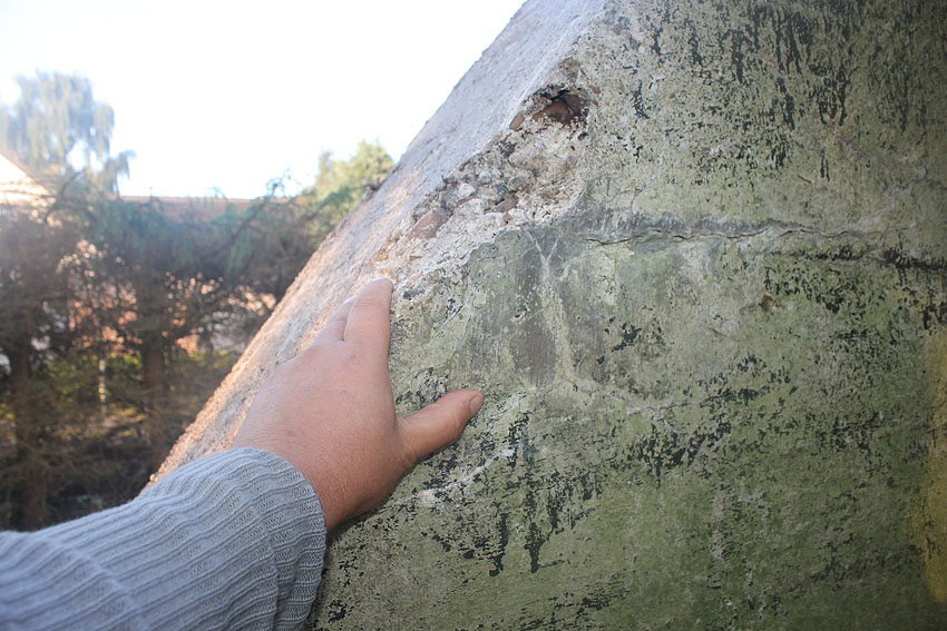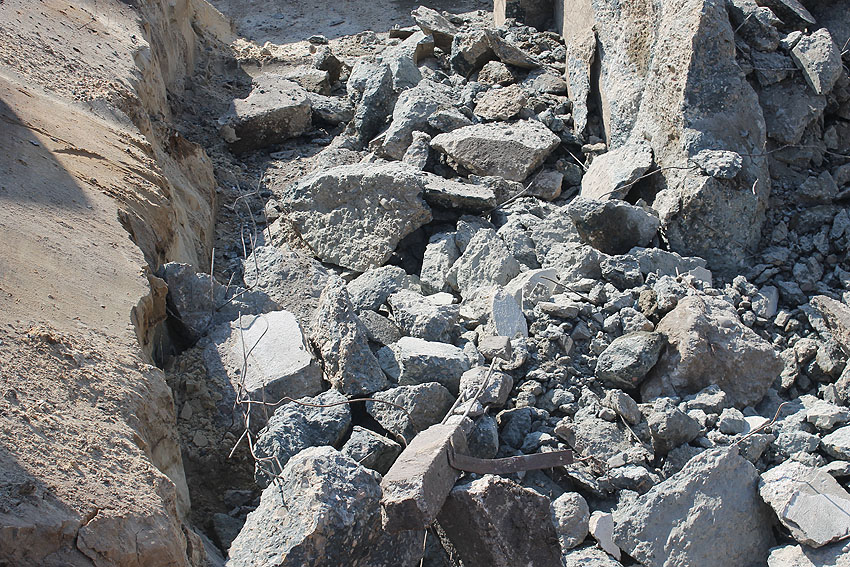 Zusätzlich lagen noch kleinere Trümmerstücke auf dem Dachbereich nahe des Notausstieges. Darunter zwei Elemente im Form von Stahbeton-Zaunpfählen.