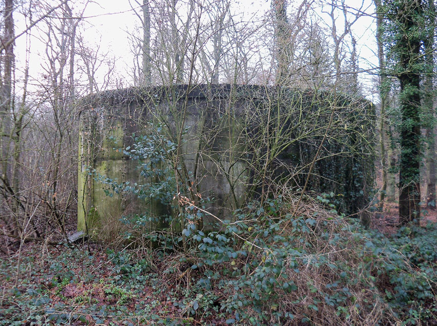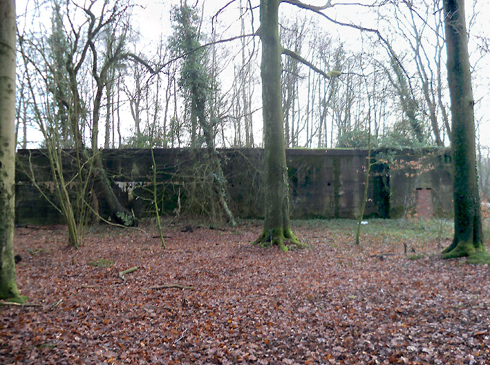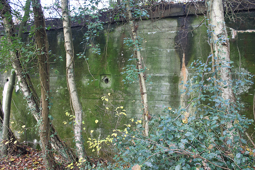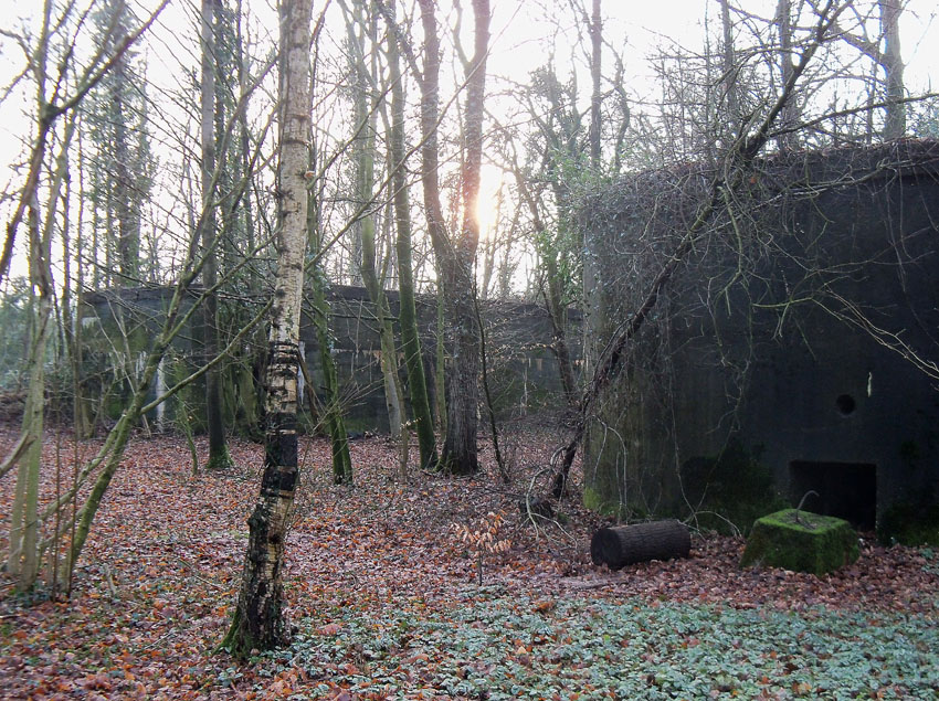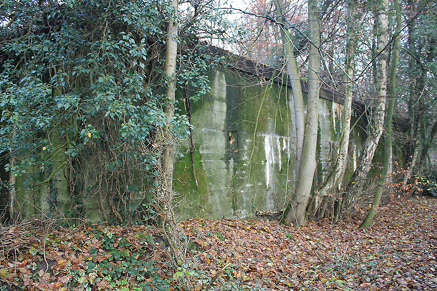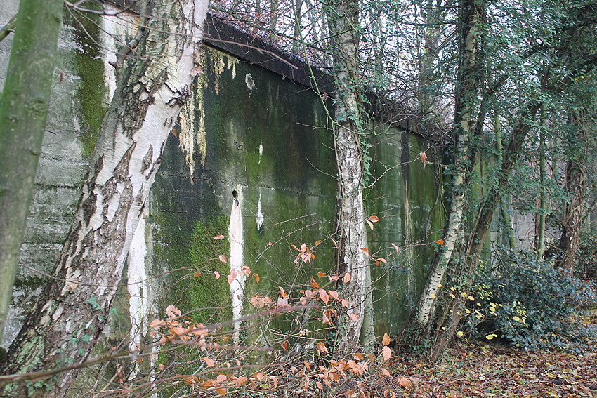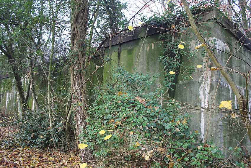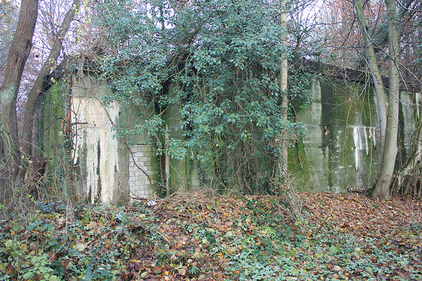 Ein rechteckiger, wohl bombensicherer Bunker (Kleinbunker) mit vier Eingängen (fast alle komplett zugemauert)...