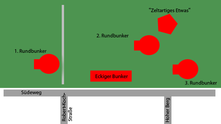 Hinweis 03/18: Rundbunker 1 / West befindet sich auf zugänglichem Landesforstgelände. Rundbunker 2 / Mitte, Rundbunker 3 / Ost und der eckige Kleinbunker sind momentan nicht zugänglich, da sie sich auf Privatgelände (Pfadfinderverein) befinden.