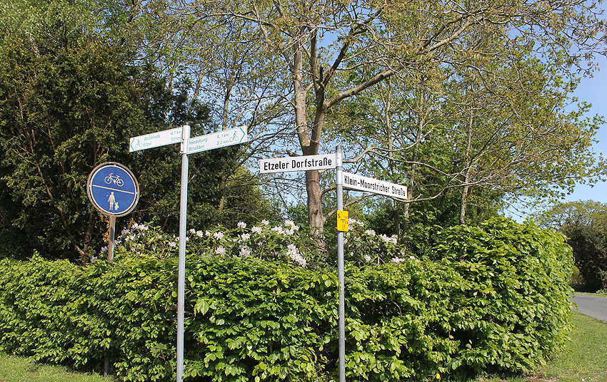 Wir waren am 10. Mai 2015 vor Ort und haben leider den Bunker nicht gefunden. Das Foto ganz oben stammt von einem Leser. Wir waren bisher selber noch nicht am Standort gewesen. Könnte es sein, dass der Erdbunker sich unter einer kleinen Anschüttung hinter dieser Hecke einige Meter weiter östlich des bisher erwähnten Standortes an der Abzweigung der Etzeler Dorfstraße / Klein-Moorstricher Straße befindet?
