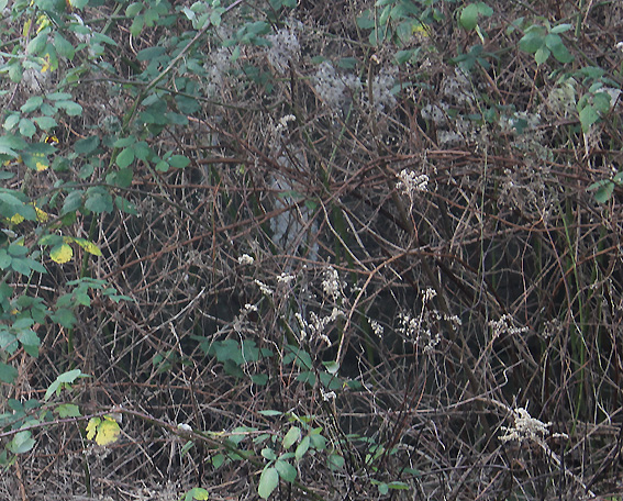 Der Deckungsgraben ist auch in der Winterzeit komplett mit Brombeersträuchern dicht überwachsen. Die Fotos entstanden am 25. Dezember. Ganz wenig ist der Bereich des Osteinganges zu erkennen.