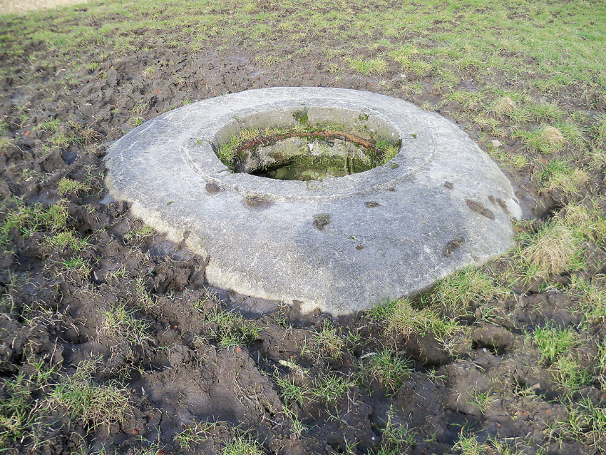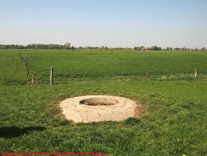 Gut zu sehen: Der Tobrukstand ist außen wie innen achteckig geformt, wie beschrieben genau wie jener an der Brücke Ellenserdammer Tief, aber auch wie die beiden Stände auf dem T 1100 Langewerth. Größtenteils waren die Ringstände lediglich innen achteckig normiert ausgeführt worden und außen rund geformt.
