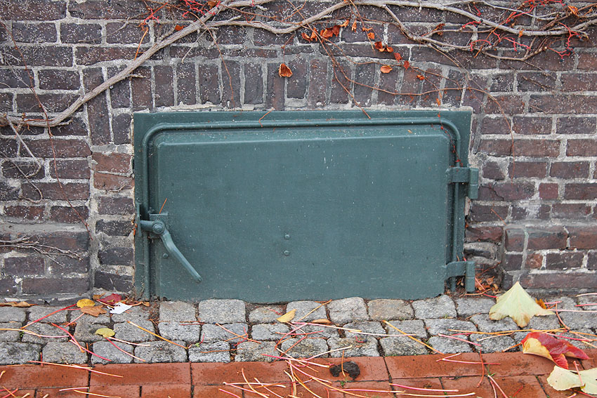 Links neben der Schutzklappe ist ein weiteres Kellerfenster im vermauerten Zustand zu sehen. Auch dahinter befand sich der LS-Kellerbereich.