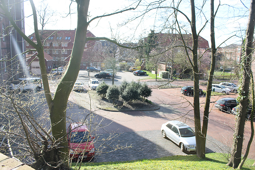 Das Gebäude oben im Hintergrund war seinerzeit noch nicht durch den Neubau links verdeckt. Der linke Bereich des Gebäudes hinten ist unten auf dem Bild rechts neben dem Rundbunker zu erkennen. Darunter die Straßenfläche wie oben. Im Bild unten links Unterstellgaragen für städtische Fahrzeuge. Heute, siehe oben, stehen die Fahrzeuge in modernisierten Unterstellgebäuden am gleichen Platze.
