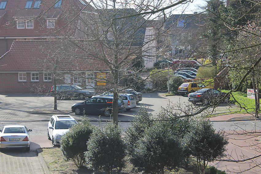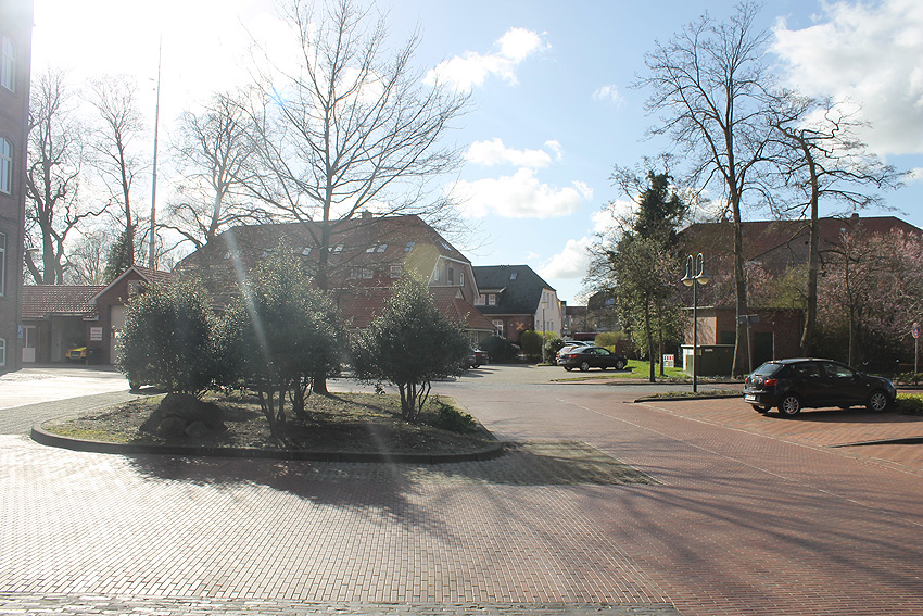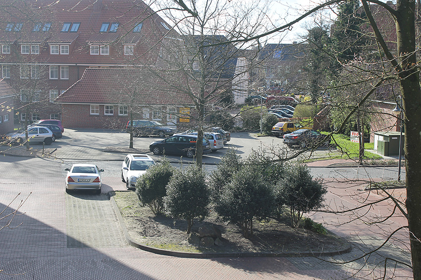 Heutige Grüninsel (ehemaliger Rundbunkerstandort) im Parkplatzbereich: Die Steine vorn im Bild haben wir uns nicht genau angesehen. Bunkertrümmer dürften dies weniger sein. Eher Findlinge / Natursteine.