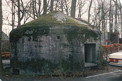 Der Splitterschutzvorbau des Bunkers wurde nach dem Krieg (höchstwahrscheinlich) entfernt. Die große Öffnung links wurde nachträglich eingebracht. Der Haupteingang (wohl bereits ohne Splitterschutzvorbau) befand sich hier nicht ersichtlich entgegengesetzt des kleinen Notausstieges (dieser rechts halb unter Erdgleiche). Es wäre aber eventuell auch möglich, dass der Splitterschutzvorbau noch existierte. Links an der Dach- und Wandkante könnte er auf dem Bild ansatzweise gerade noch erkennbar sein.