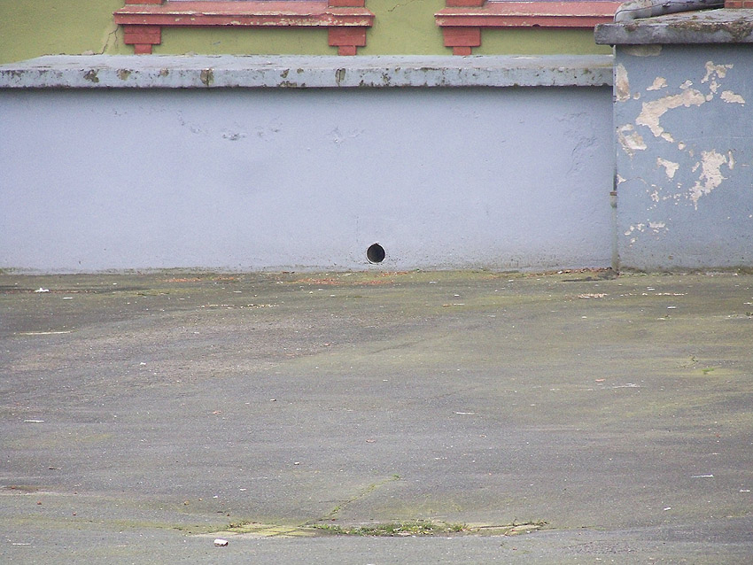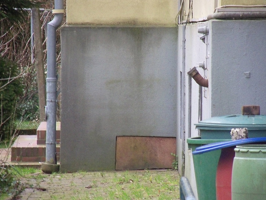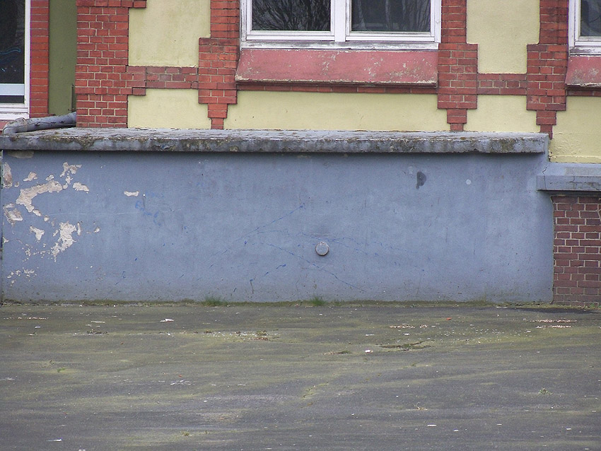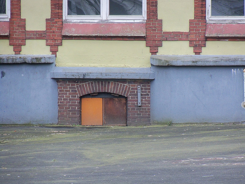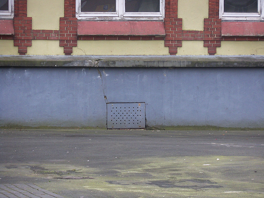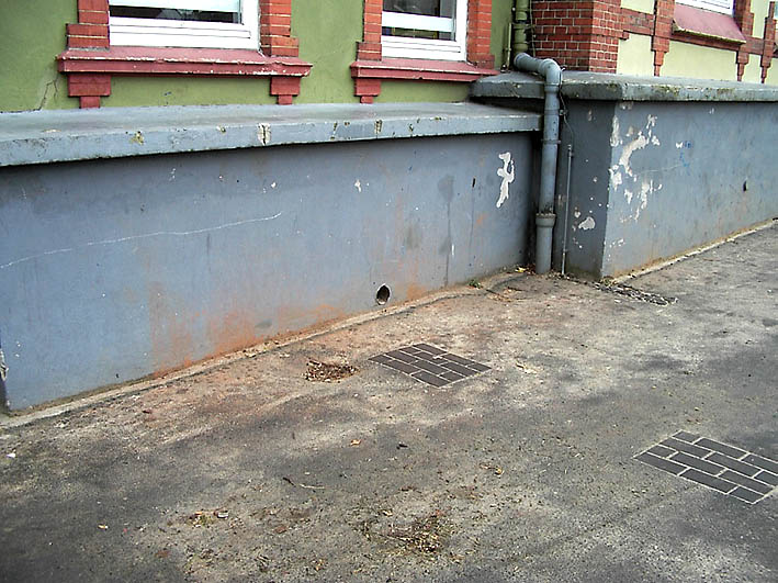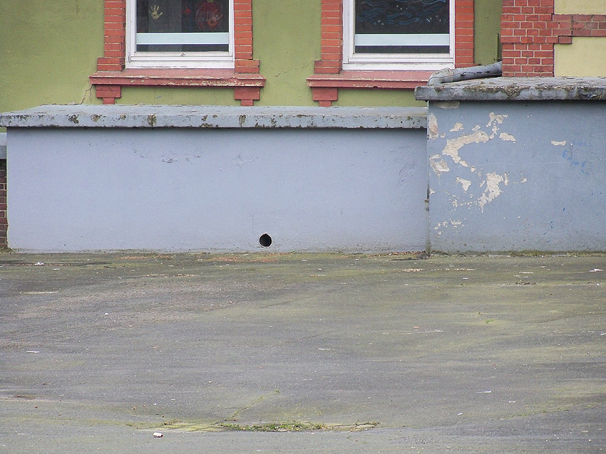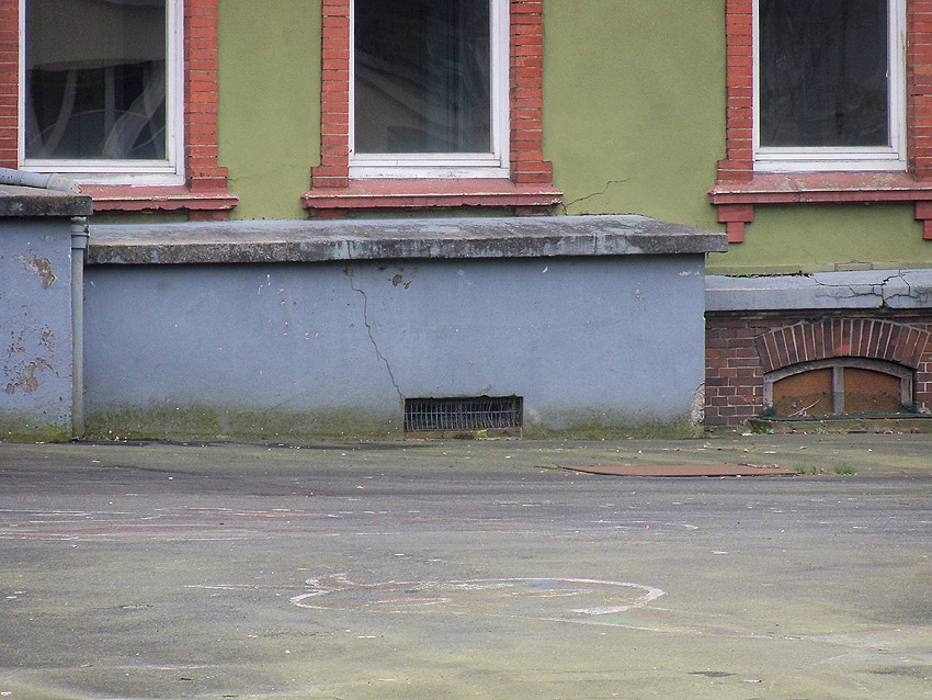 Im rückwärtigen Teil der ehemaligen Schule / an der Ostwand ist diese versiegelte Öffnung im Sockelbereich zu erkennen: