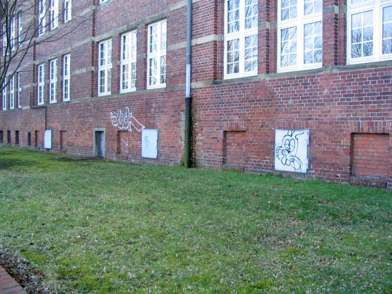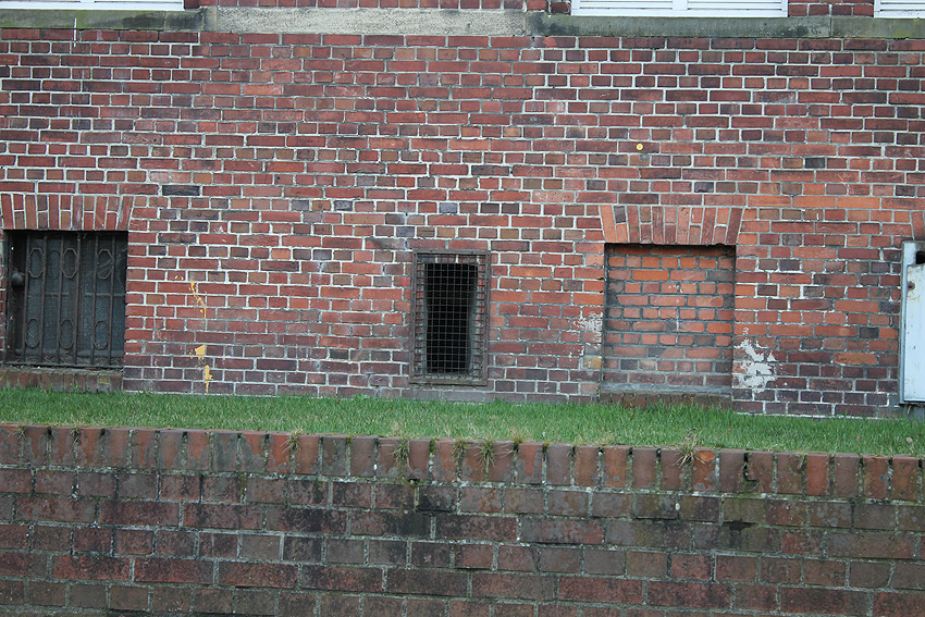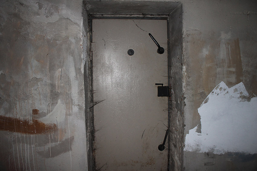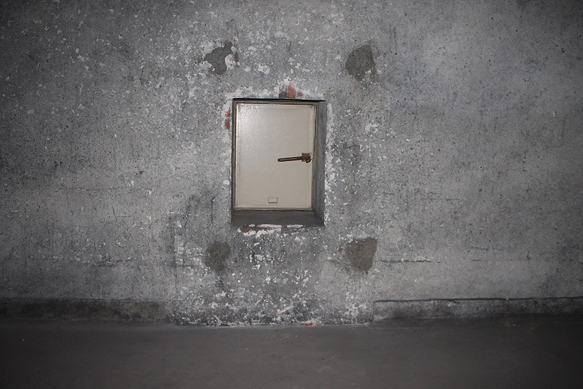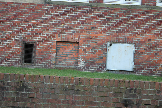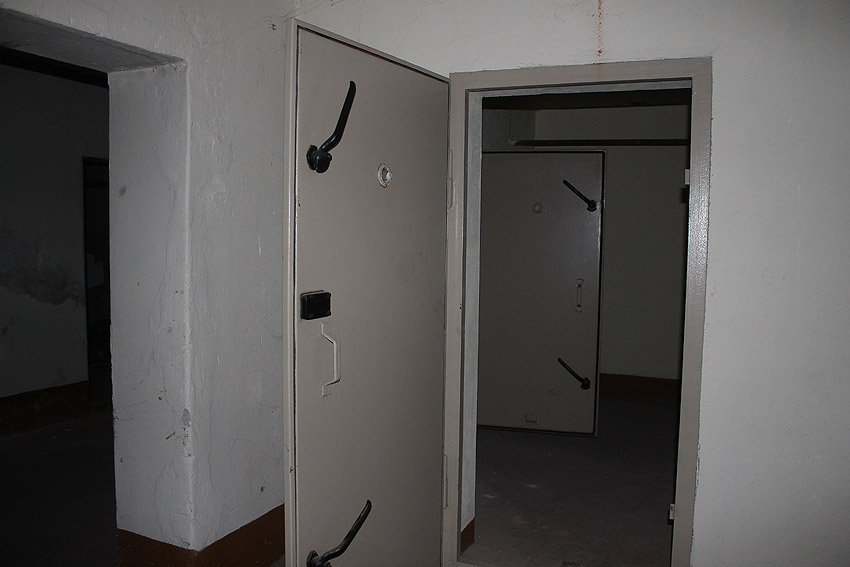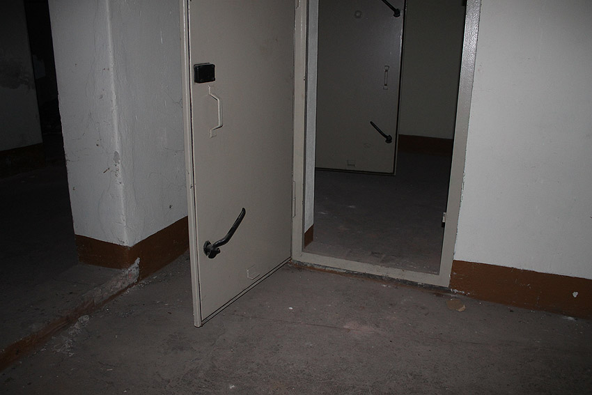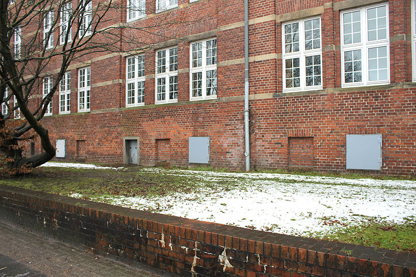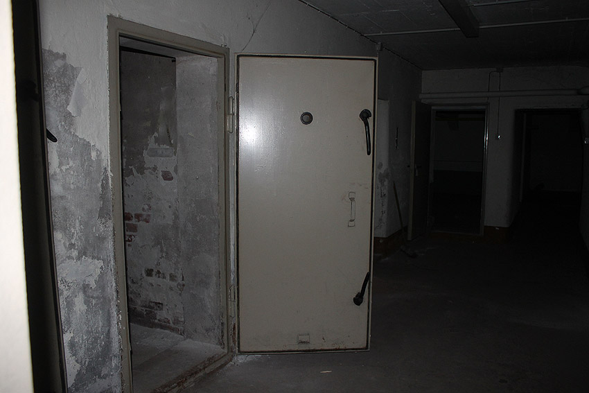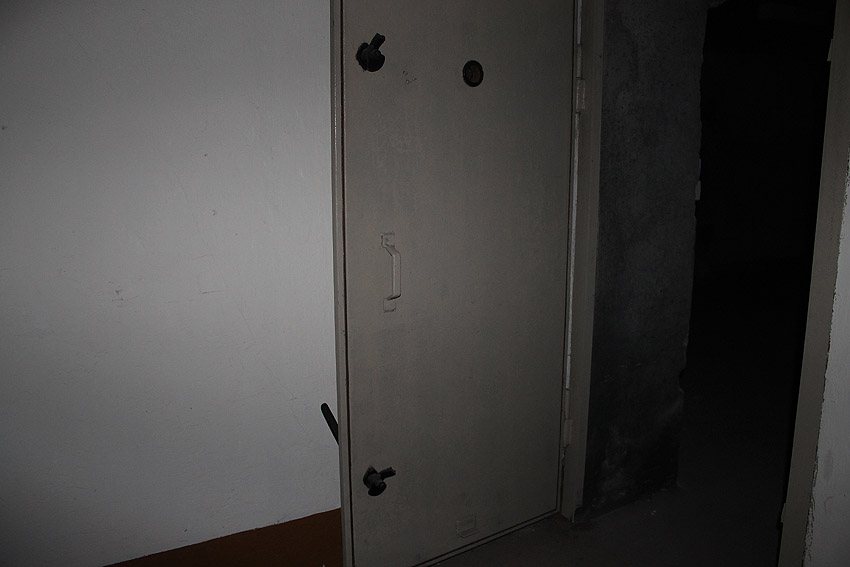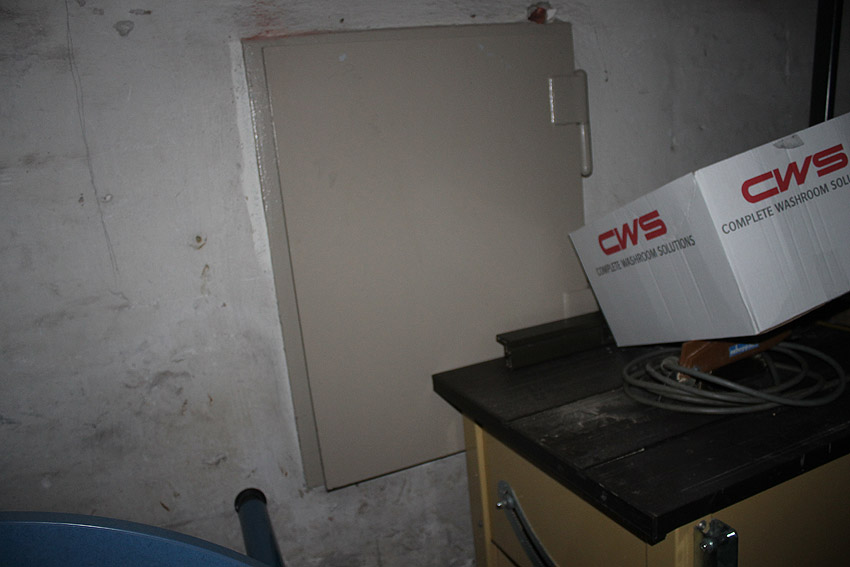Stand 2024: Im Zuge einer Sanierung des Gebäudes wurden die Luftschutzklappen und die Luftschutztür mittlerweile hellbraun angestrichen.