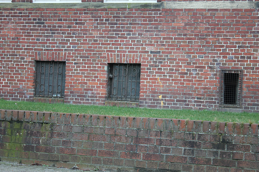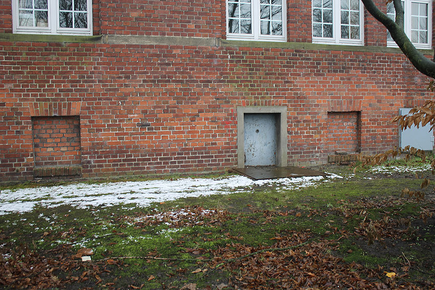 Rechts neben der hinteren Luftschutzklappe ist der teilversenkte Luftschutzkellereingang mit Luftschutztür zu erkennen.