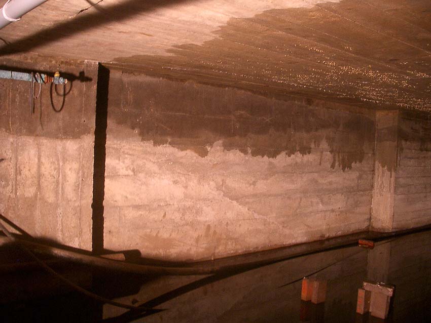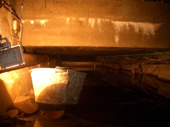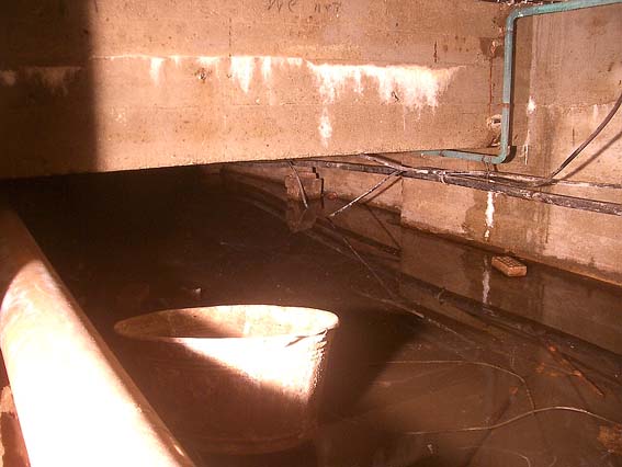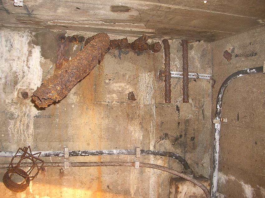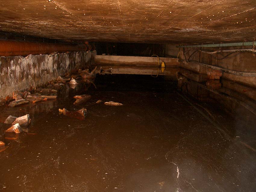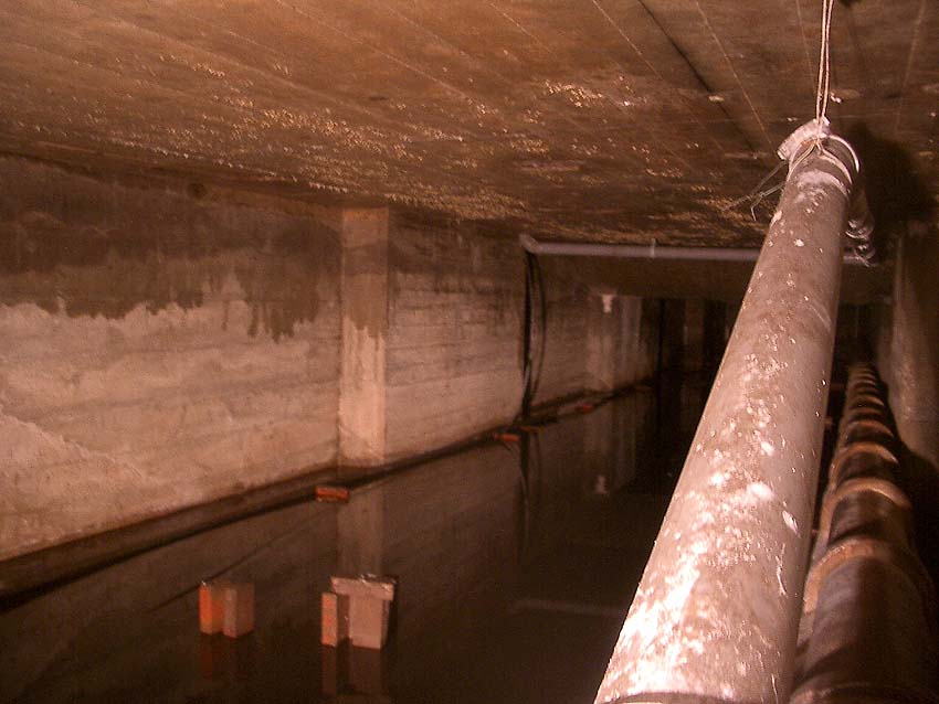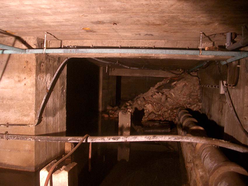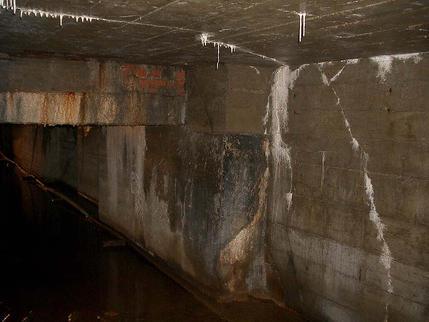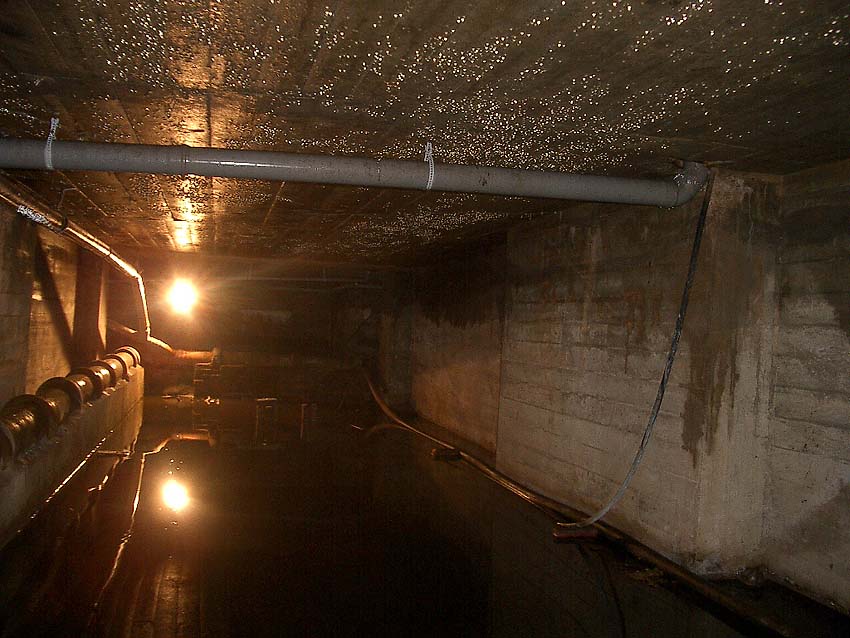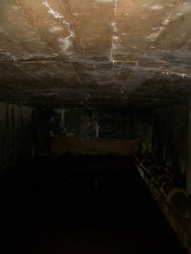 Das Innere des Ostbereiches der Anlage direkt unter dem östlichen heute abgetrennten Gebäudebereich / Hallenbereich. Ein halbkellerartiges Geschoss unter Erdgleiche. Eine Art Kriechkeller mit 1,80 Metern Höhe, hier liefen innerhalb der angelegten Versorgungssystemverbunkerungen unter anderem Versorgungsleitungen für den westlich gelegenen Schnürboden und seinen wohl jedoch nicht bombensicheren Tiefbunker zusammen. Der Hauptgang erstreckt sich mittig des Komplexes unter der gesamten Fläche von Westen direkt vom Bunker aus nach Osten. Ob hier in diesem Bereich in späten Kriegstagen auch Menschen Schutz suchten, bleibt ungewiss. Die Gänge boten auf jeden Fall Splitterschutz sowie Trümmerschutz. Teile stehen heute unter Wasser.