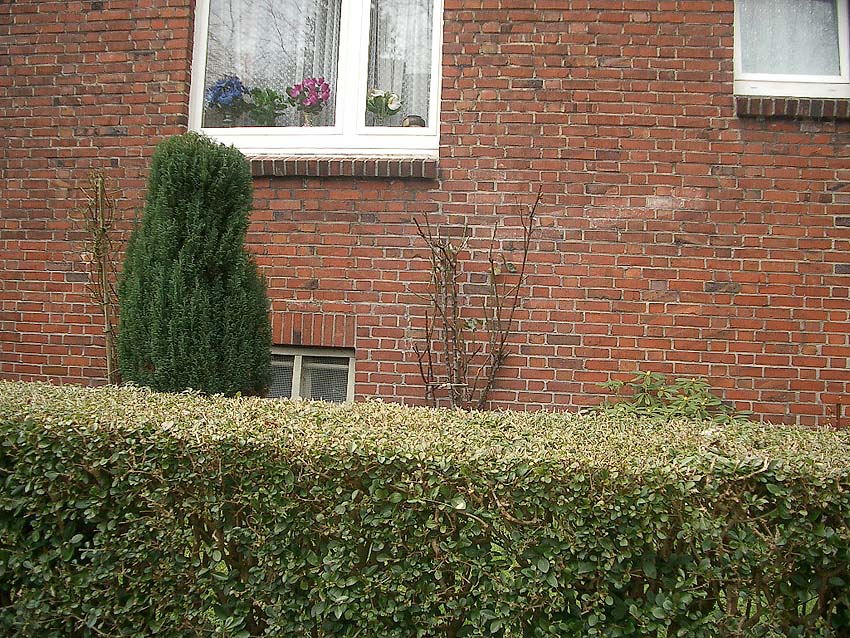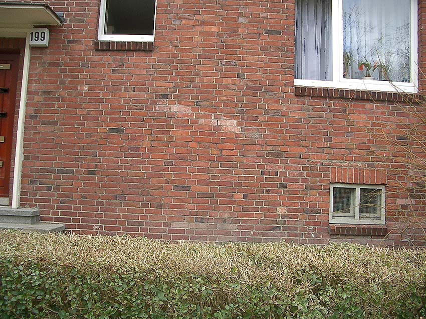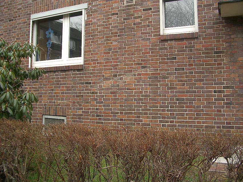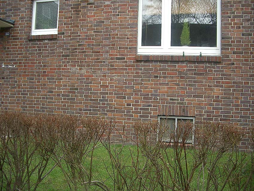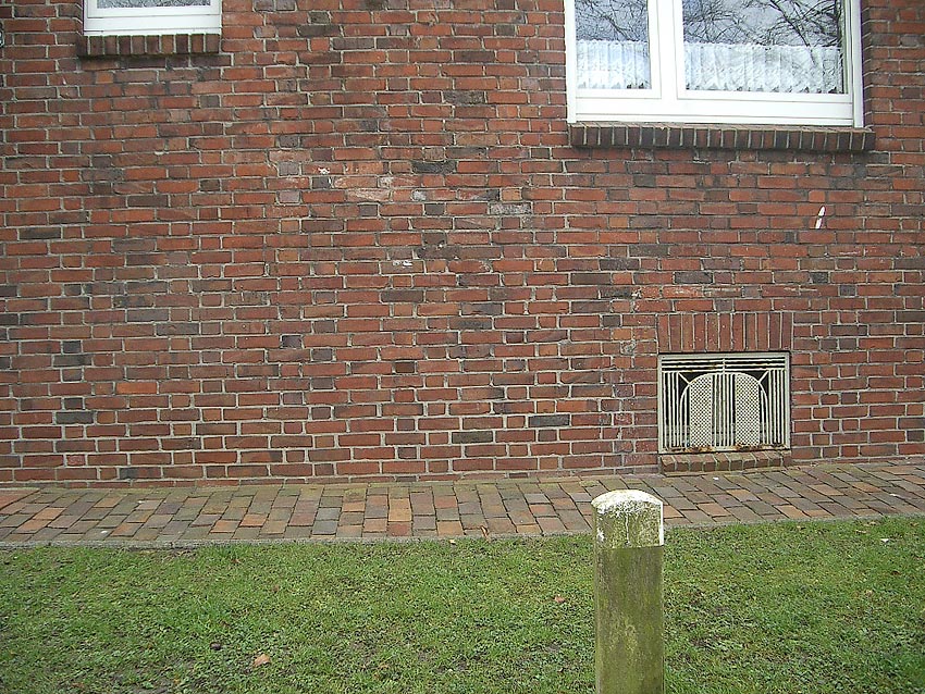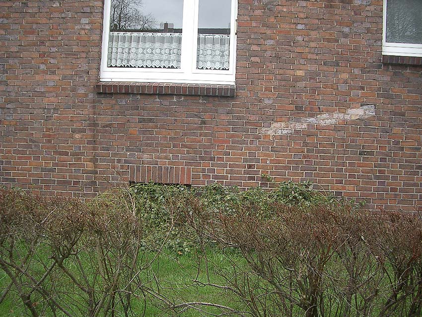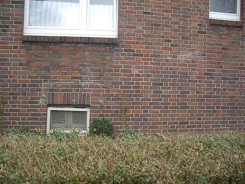Auch vor den nachfolgend abgebildeten ehemaligen LS-Kellerfenstern waren wie vor diversen anderen Kellerfenstern im Stadtgebiet Betonblöcke gelagert worden. Sie sollten Schutz vor Detonationsdruck bieten. Auch auf den nachfolgenden Bildern sind Reste der Putzfugendichtung teilweise noch gut zu erkennen...